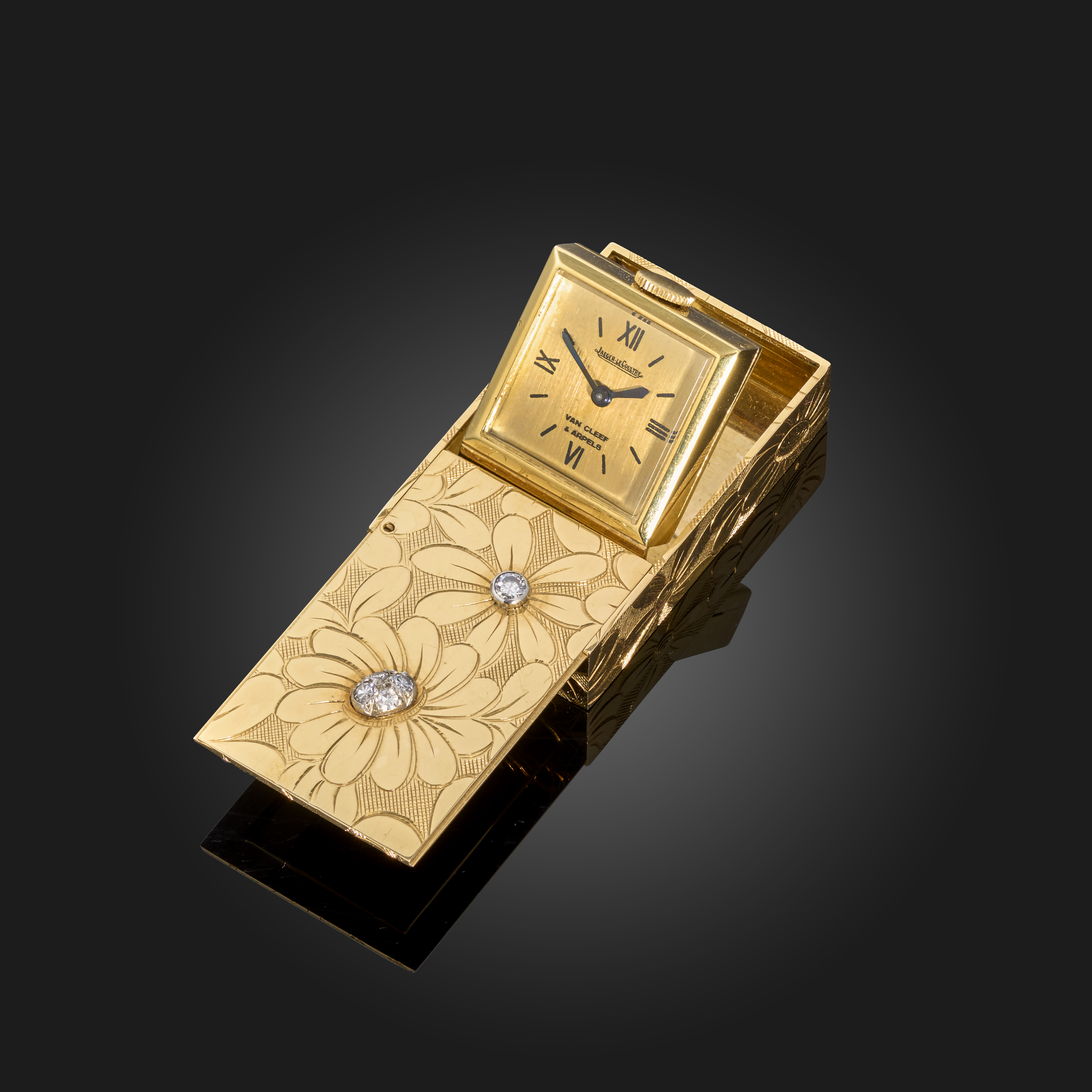 A diamond-set gold travel clock by Jaeger LeCoultre for Van Cleef & Arpels