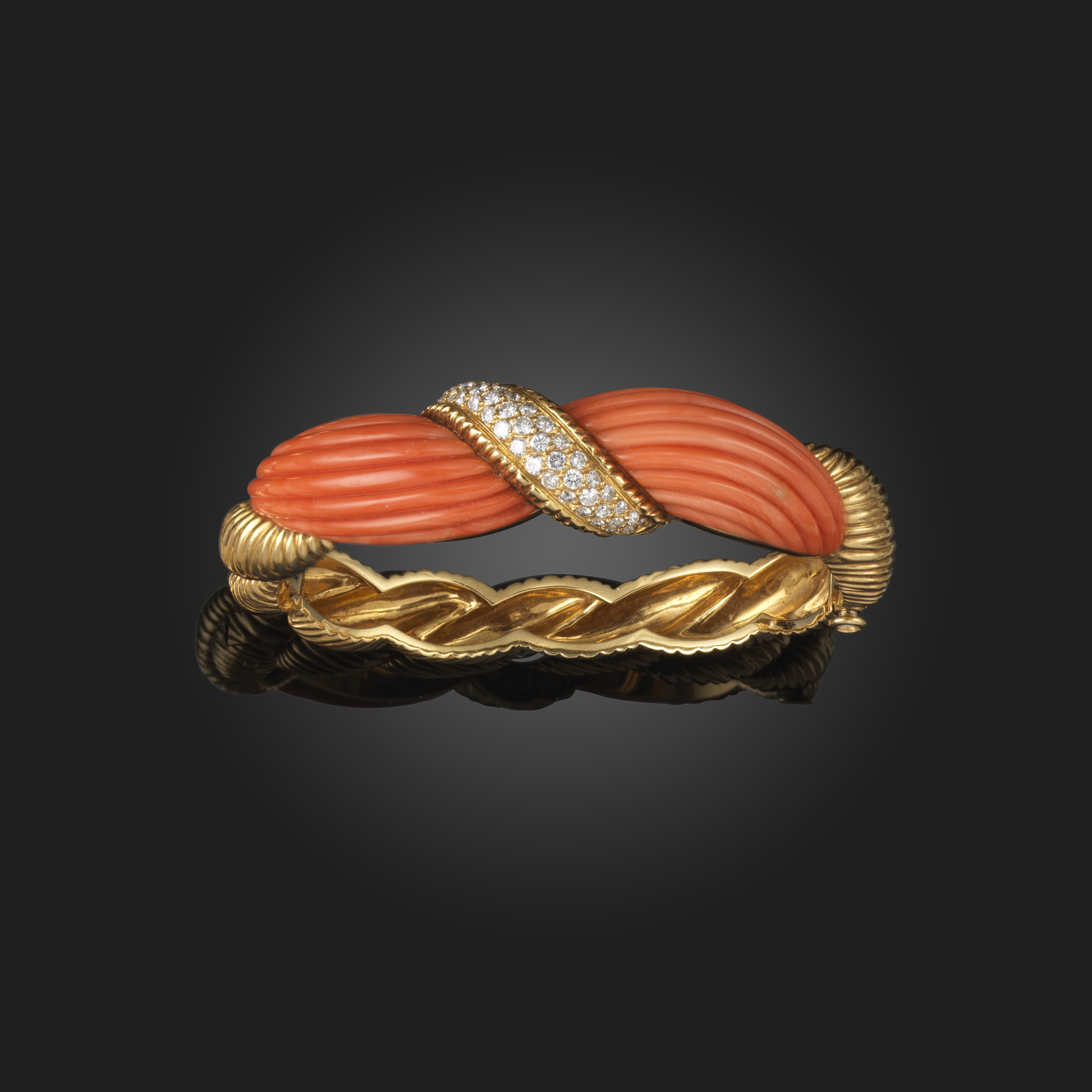 λ A French diamond and coral gold bangle, c.1970, the hinged scrolling fluted gold bangle with carved fluted coral sections, the centre pavé-set with round brilliant-cut diamonds, French control mark, maker's mark, 5.2cm diameter