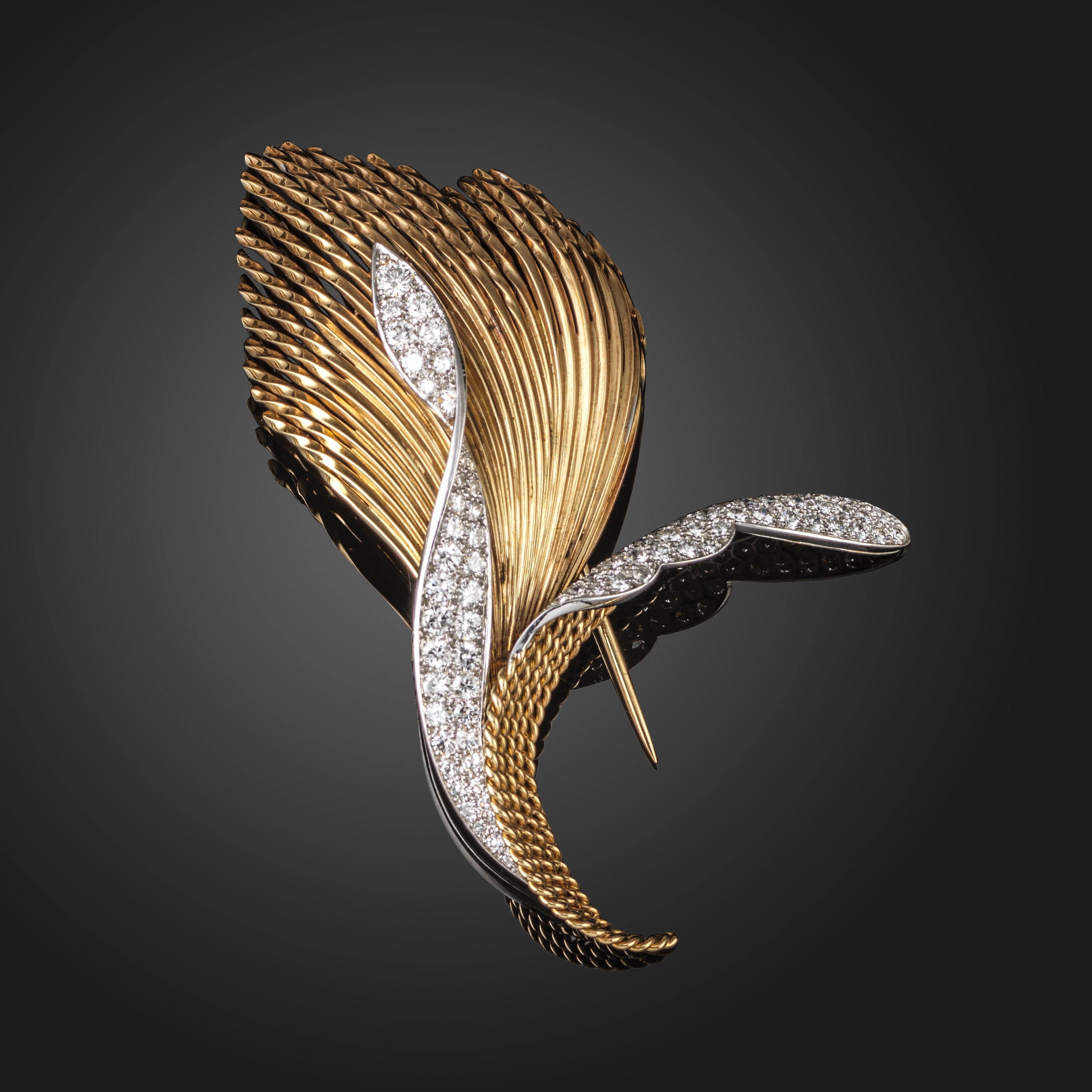 A diamond-set gold foliate brooch by Sterlé, c.1950's, with twisted gold fronds, two sections pave-set with round brilliant-cut diamonds in platinum and gold, signed Sterlé, numbered 4.340, 8cm high