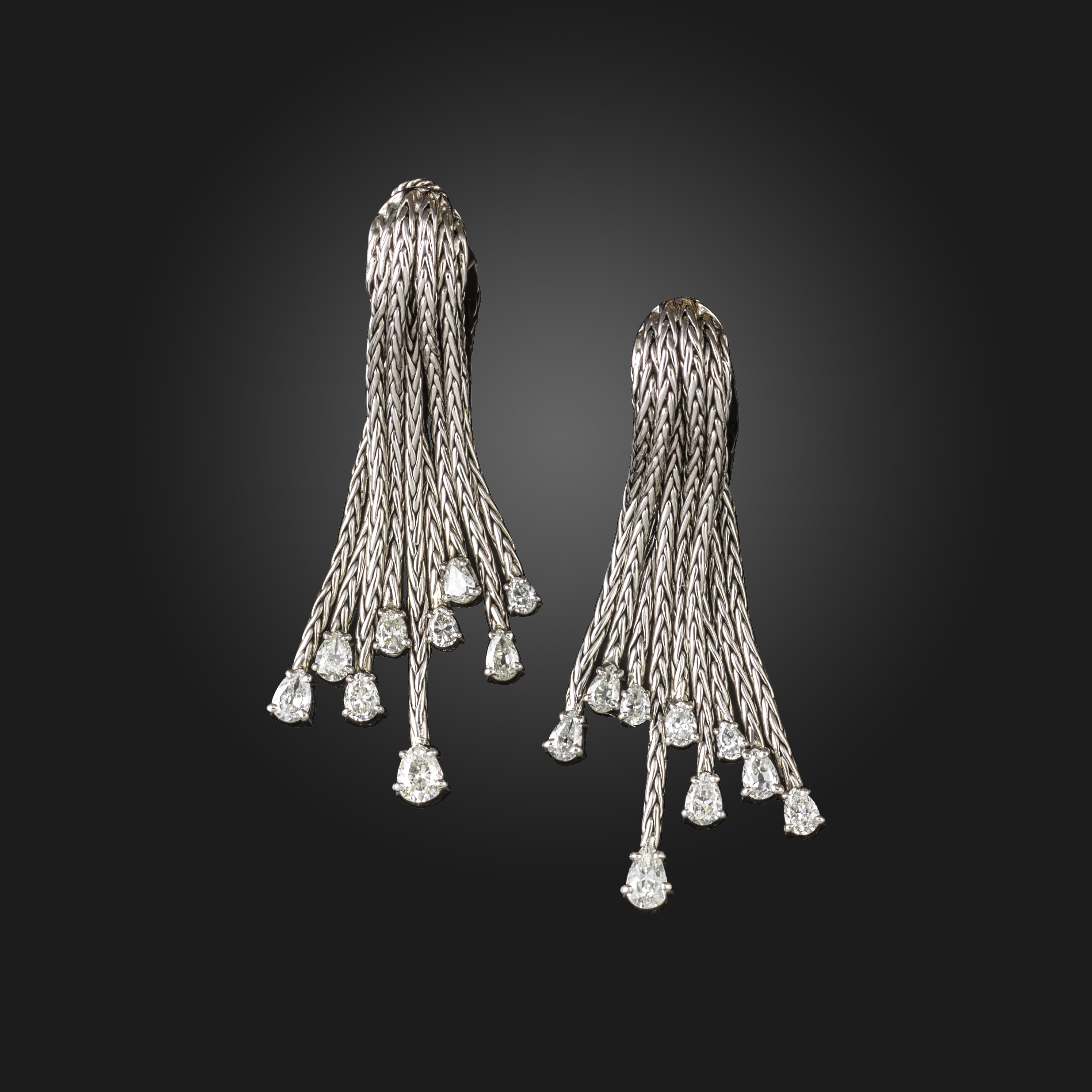A pair of diamond-set 'Angel Wire' earrings by Sterlé, c.1950's, formed with plaited tassels, the terminals set with graduated pear-shaped diamonds in platinum, French control mark, rubbed maker's mark, signed Sterlé Paris, numbered 2130, clip fittings, 6cm high