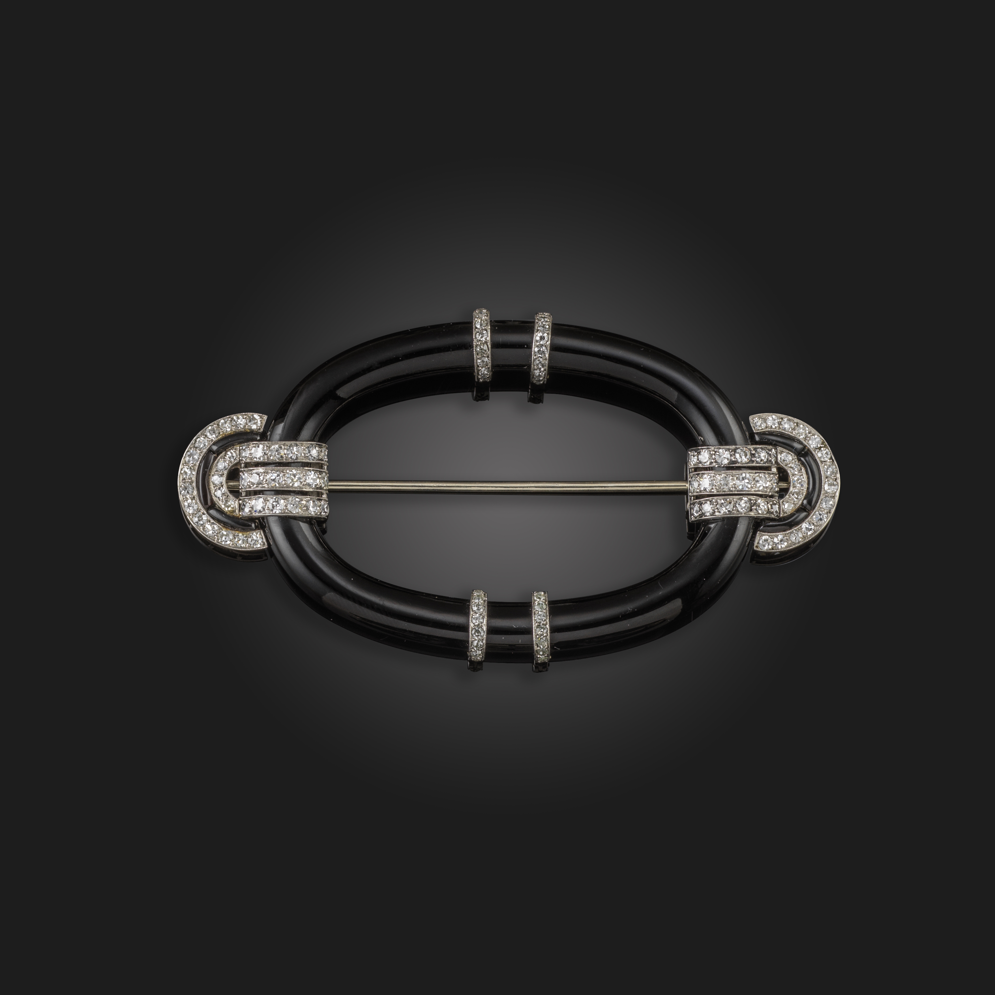 An Art Deco onyx and diamond brooch by Marchak, the oval onyx frame mounted in platinum, with diamond-set demi-lune terminals set with single-cut diamonds and onyx sections, with four platinum diamond-set hoops, signed Marchak Paris (obscured), 8cm wide