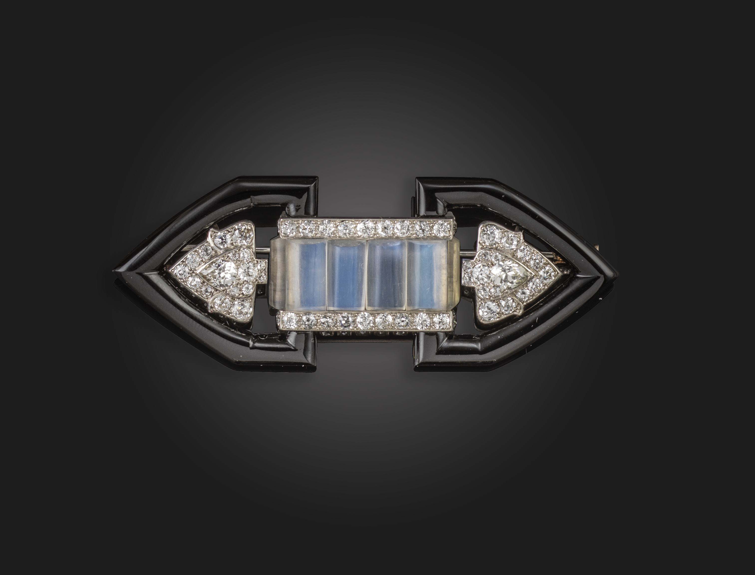 An Art Deco onyx, moonstone and diamond brooch, the arrow-head onyx terminals centred with diamond-set blossom-form sections each centred with an old pear-shaped diamonds, the centre set with semi-cylindrical moonstone plaques between rows of circular-cut diamonds, obscured signature, 7cm wide