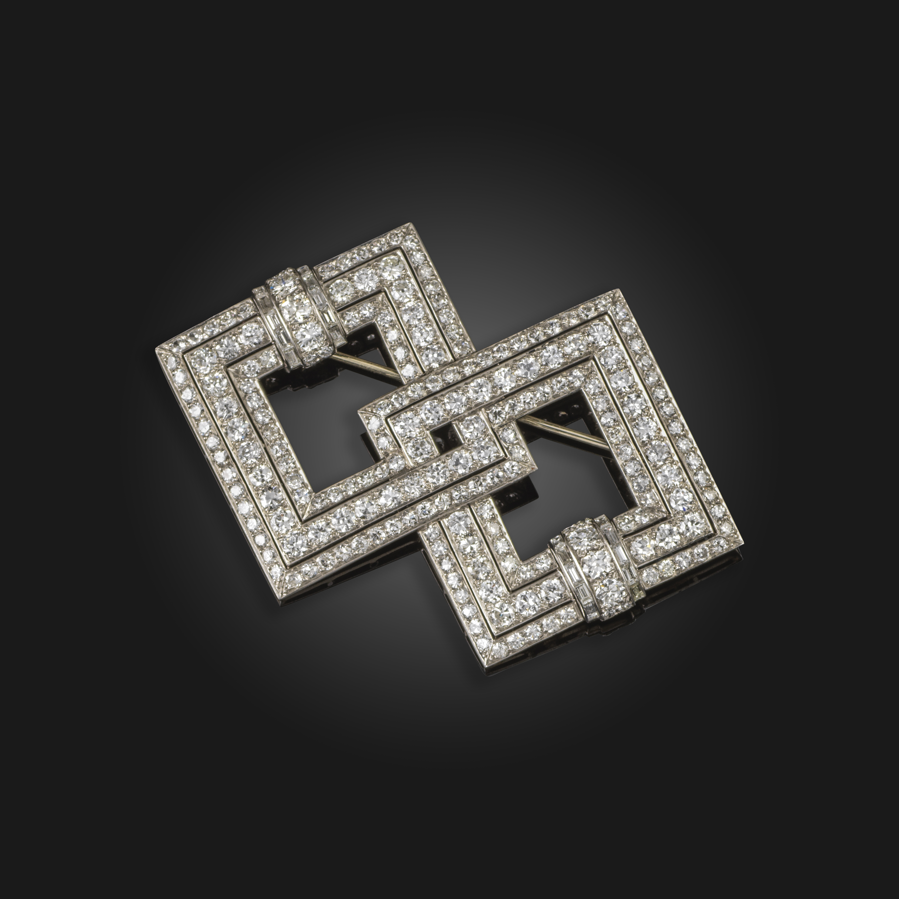 An Art Deco diamond brooch, designed as interlocked squares, pave-set overall with circular-cut diamonds and a further domed band set with graduated circular-cut diamonds within borders of baguette-shaped diamonds in platinum, obscured inventory number to pin fitting, diamonds approximately 9.00cts total, 7.5cm wide