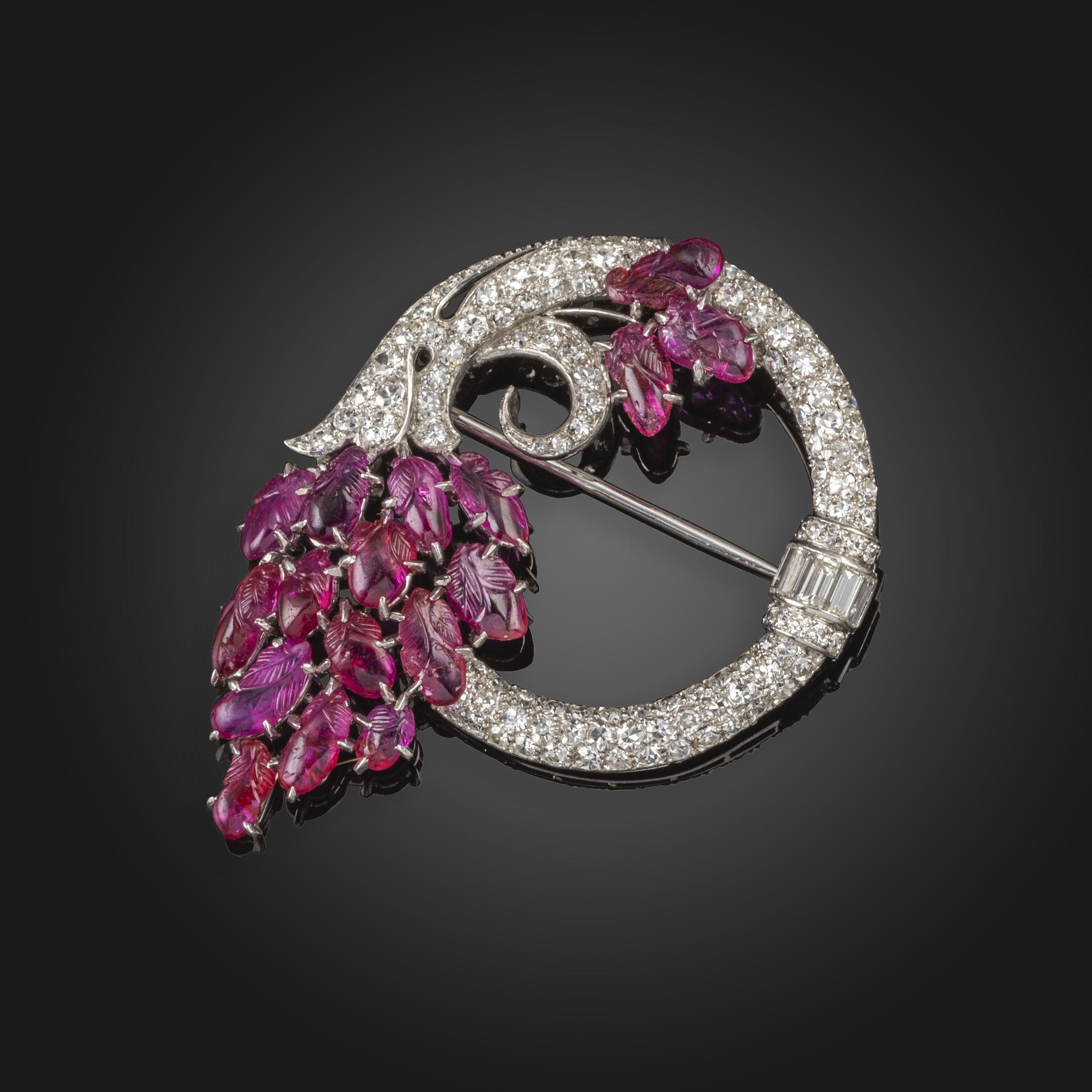 A carved ruby and diamond circular brooch, c.1930's, the stylised cornucopia brooch pavé-set overall with round brilliant-cut and single-cut diamonds, with further baguette-shaped diamonds and carved rubies in the form of blossom buds in platinum, 5.5cm widest