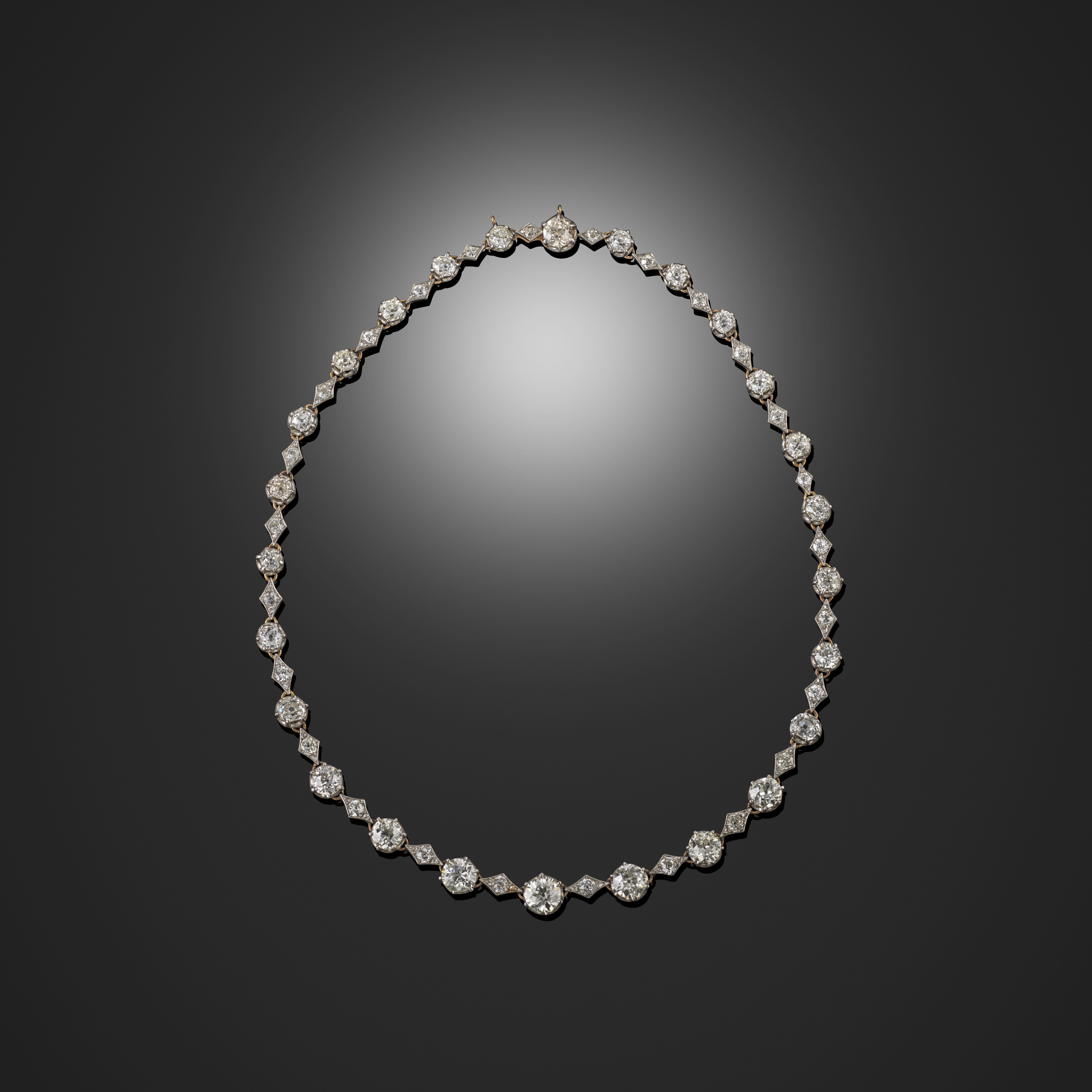 A French early 20th century diamond necklace, the graduated old circular-cut diamonds are alternately-set with lozenge-shaped links set with old circular and rose-cut diamonds in platinum on gold, French control marks, principal diamond approximately 1.10cts, diamonds approximately 13.00cts total, 36.5cm long