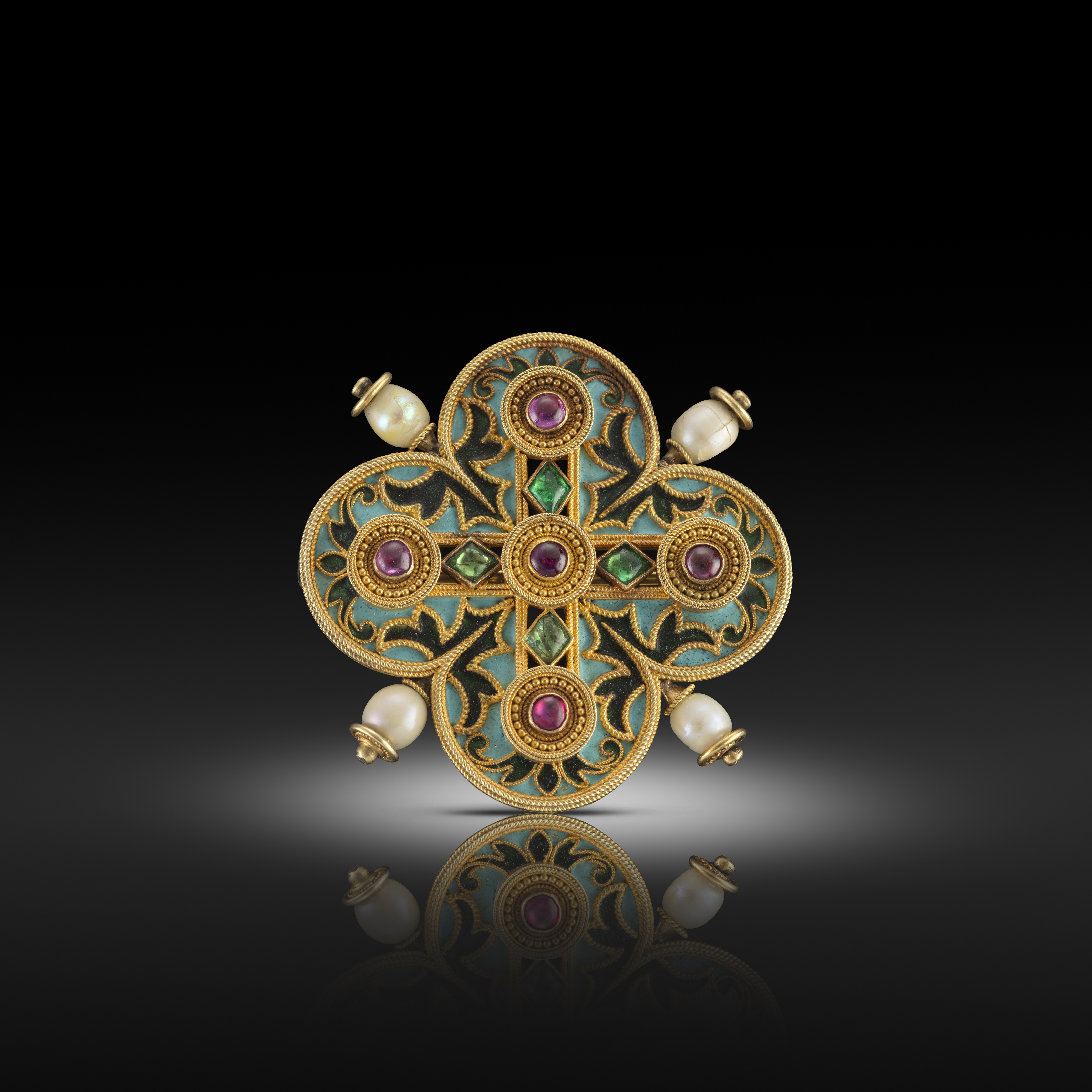 A gem-set and enamel gold brooch by Castellani, c.1860, of quatrefoil design, with green and turquoise enamel decoration, set with cabochon rubies and emeralds and with ropetwist and pellet decoration in gold, the four pearl terminals with gold caps, signed to reverse, pearls untested, 5cm wide
