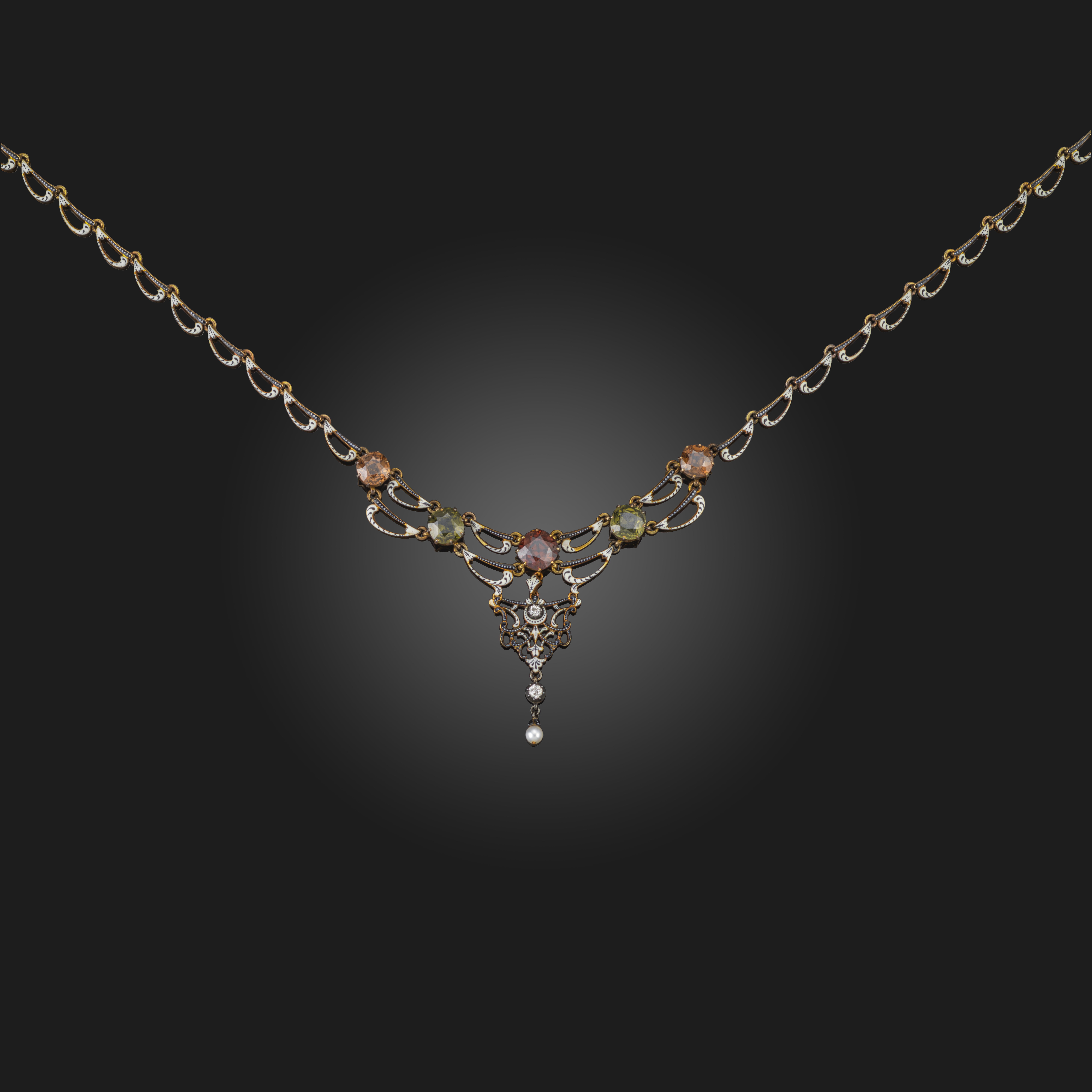 A Renaissance Revival gem-set and enamel gold necklace by Giuliano, c.1895, the openwork gold scroll necklace with black and white enamel decoration, set with five vari-coloured cushion-shaped zircons, suspending a foliate scroll gold drop pendant with conforming enamel deocarion and set with a diamond, suspending a further old cushion-shaped diamond in a cut-down collet and a pearl, signed to the clasp C&AG, 37cm long