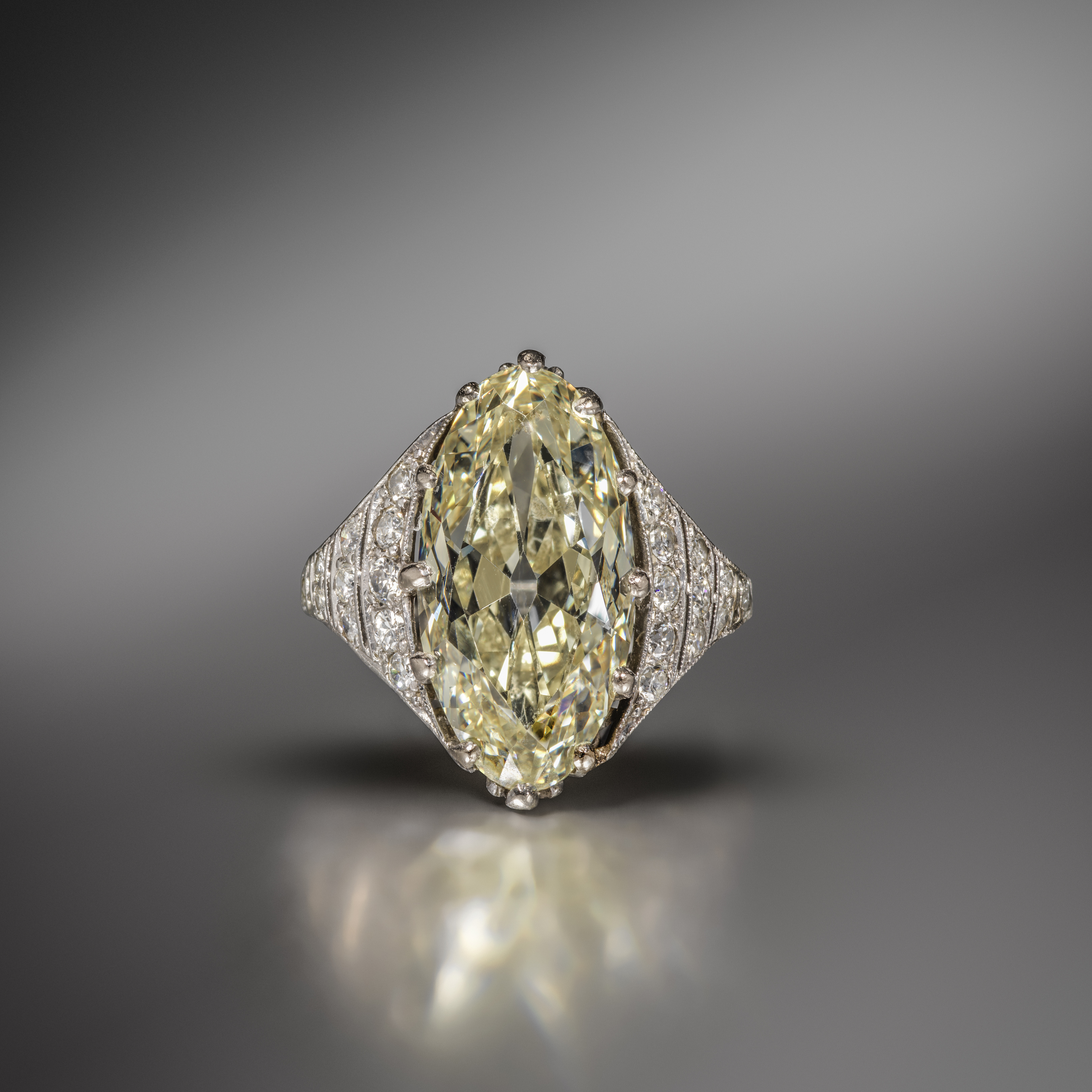 An Art Deco marquise-shaped diamond ring, set with an old-cut marquise-shaped diamond weighing approximately 4.80cts, within graduated shoulders set with old cushion-cut diamonds millegrain-set in platinum, size J 1/2, in Wartski case
