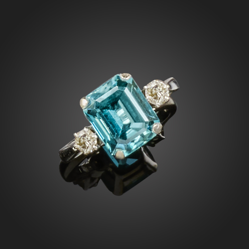 A zircon and diamond three-stone ring, the emerald-cut blue zircon is set with a round brilliant-cut diamond to each shoulder in white gold, size L