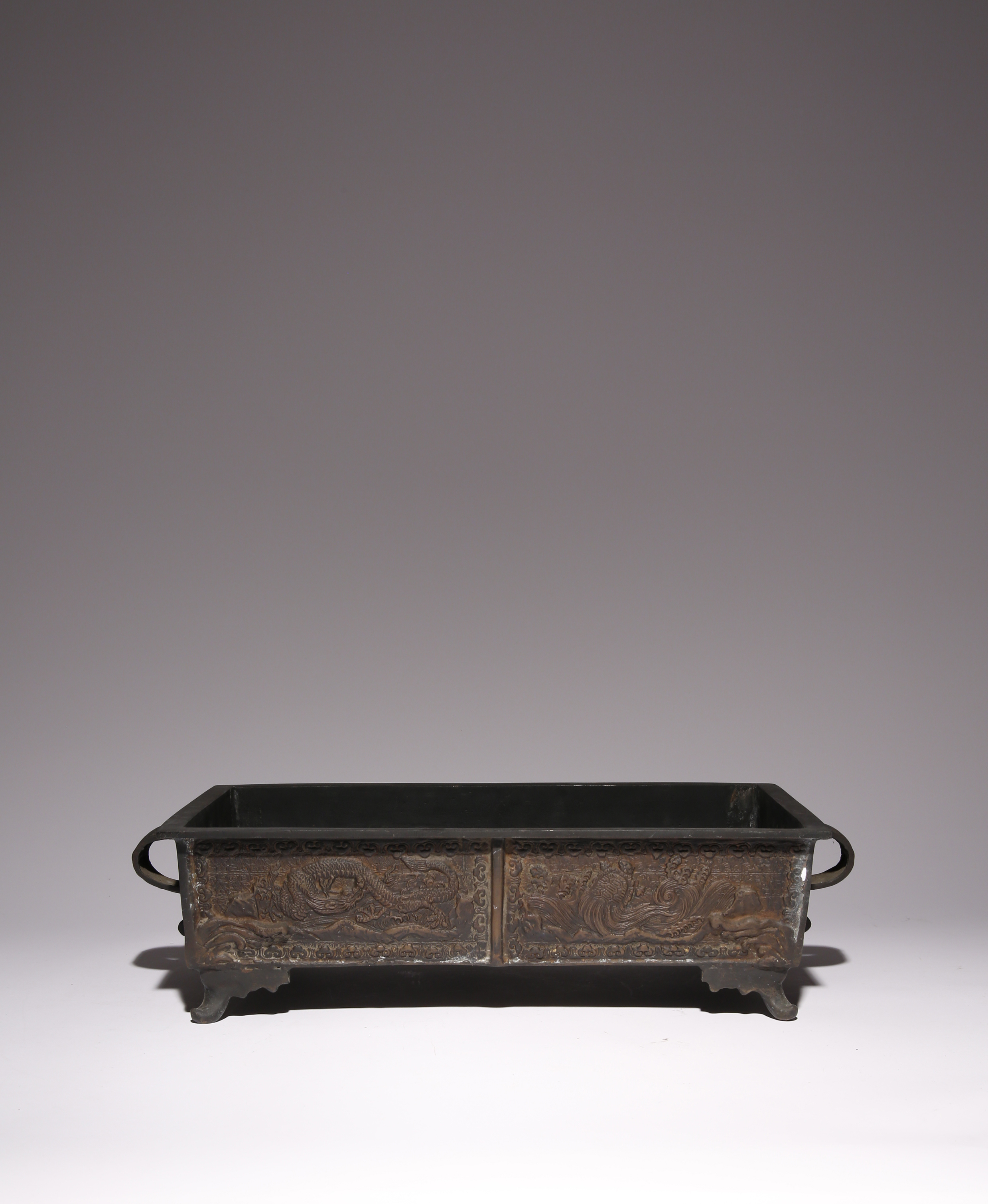 Raised on four curved legs and with two scrolling handles, the sides cast with a dragon, a minogame, a kirin and a phoenix, the four mythological animals amidst clouds, waves, and a leiwen ground, the base with a nine characters seal mark reading Dai Nihon Bunsei chu, 12.4cm x 48.5cm x 26.2cm.
