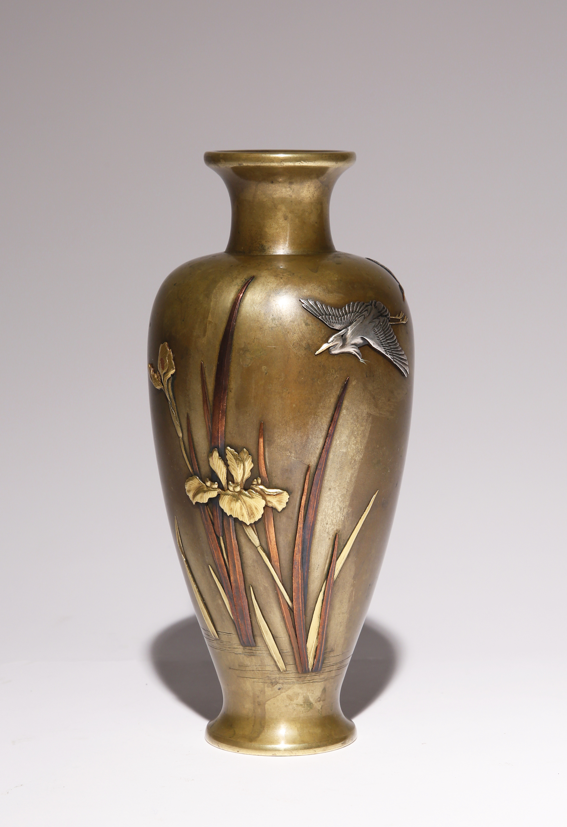 The baluster body decorated with tall irises emerging from shallow waters, with two cranes in flight above, the decoration in low relief and rendered in mixed metals including gold and silver, the side incised with three characters for Kowa and the base with a silver seal mark for Kanyu, 23.5cm.