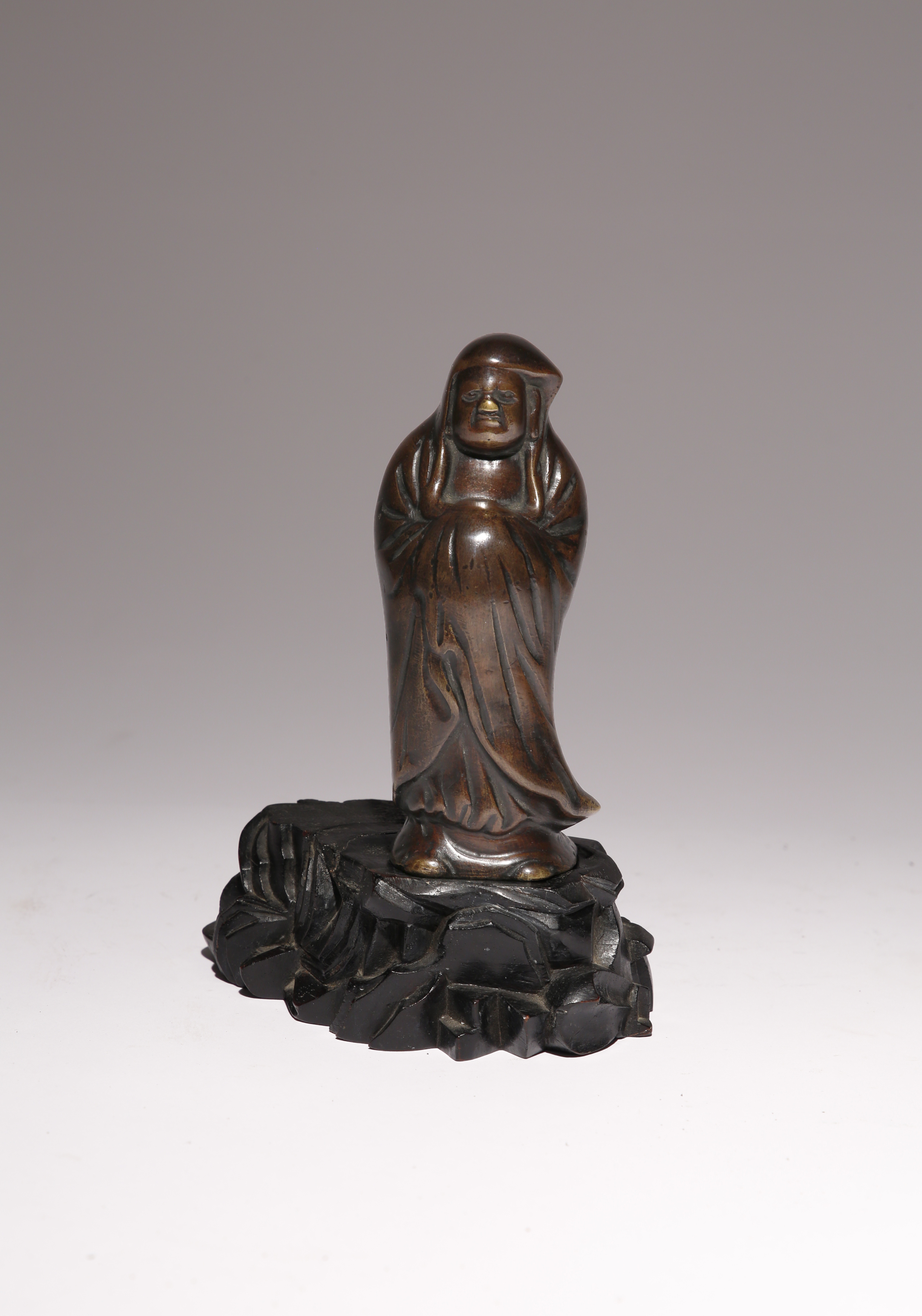 The Father of Zen Buddhism depicted standing, wearing long robes covering his head and revealing his chest, raised on an associated wood stand carved as a rocky outcrop, the bronze 13.5cm. (2)