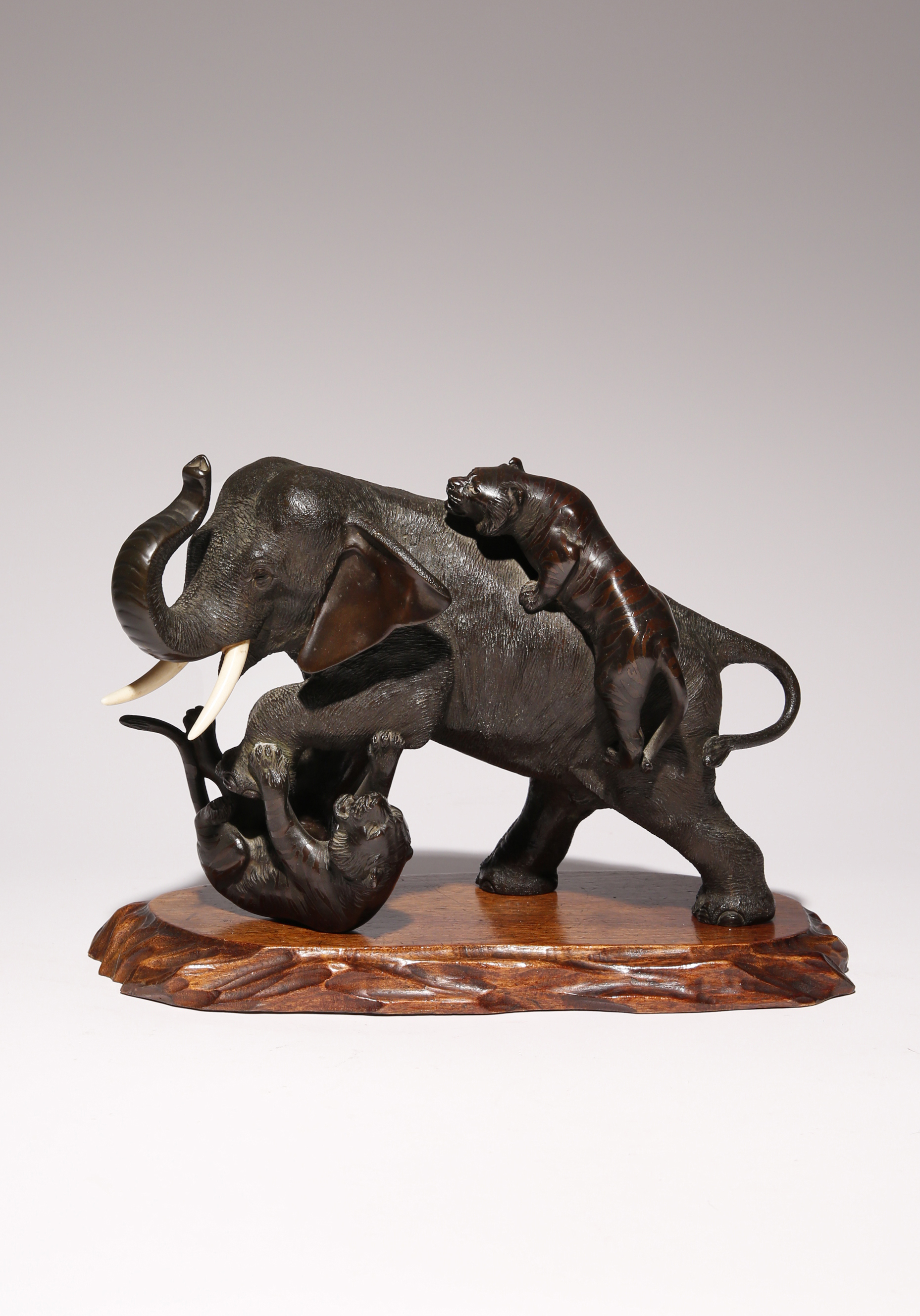 The pachyderm fending off the attack of two tigers, its front leg lifted and about to crush one feline whilst the other clambers upon its back, with ivory tusks and inscribed to the belly Seiya zo for Genryusai Seiya, together with a wood base, 28.5cm wide. (2)