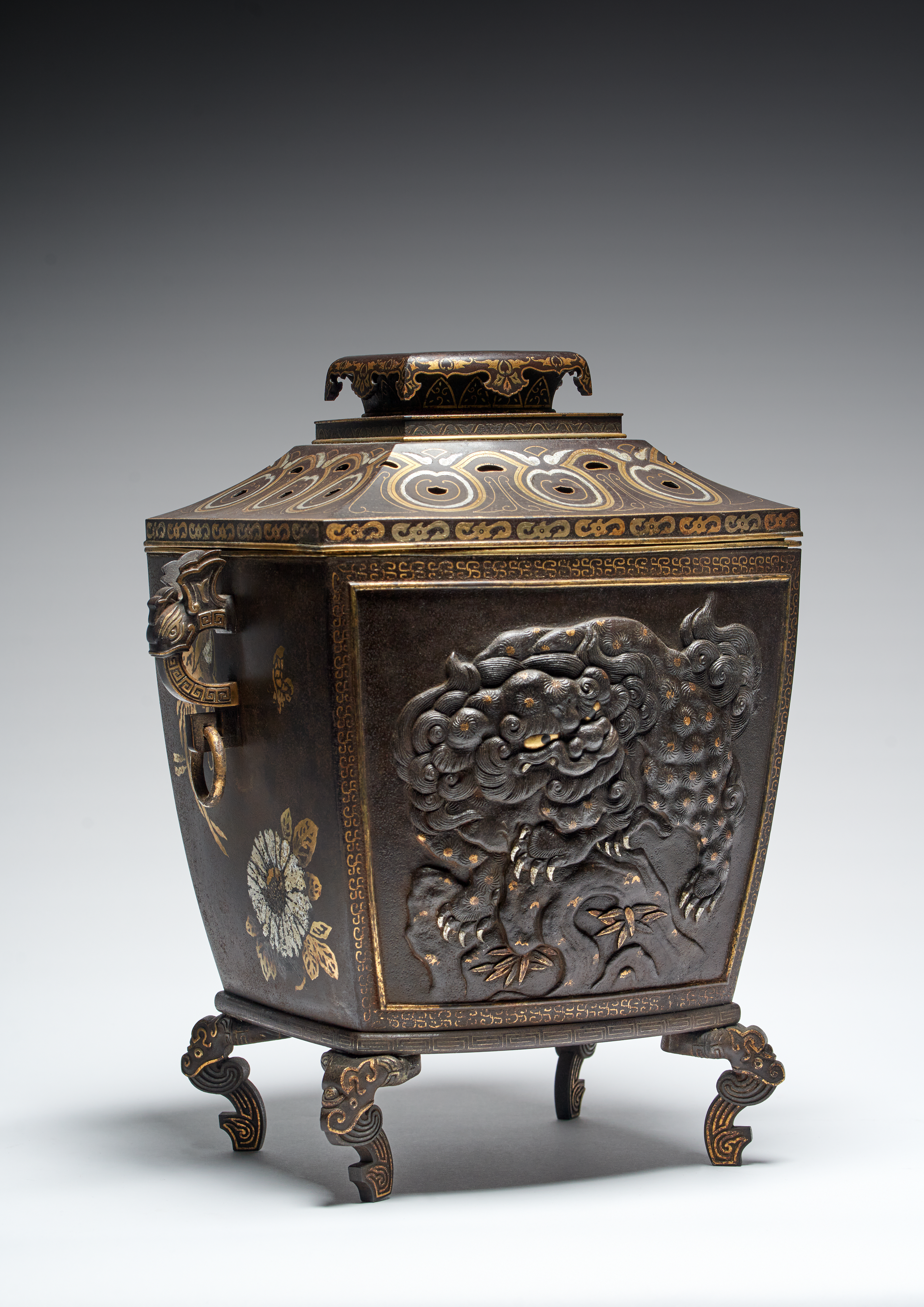 The incense burner of rectangular form and decorated with Fudo Myoo and his two attendants Kongara and Seitaka, the powerful King of Immutable Wisdom and Vanquisher of Evil holding the kurikara (devil-subduing) sword and a lasso to catch and bind up the wicked; the God and his acolytes surrounded by the halo of flames that destroys ignorance; the opposite side with a large shishi clambering upon a rock; the other sides each with a long-tailed bird in flight holding a knotted cord in its beak, and a large chrysanthemum flower underneath; the cover decorated with geometric patterns and shaped apertures for the smoke to escape, the underside of the lid with a cut-out design of a similar bird; all raised on four legs shaped as archaistic monsters, the handles to the side with further stylised creatures suspending loose rings; the decoration rendered in low relief and with details inlaid in silver and gold, inscribed Myochin ki Munenori beside Fudo Myoo to the front, 40cm. (3)