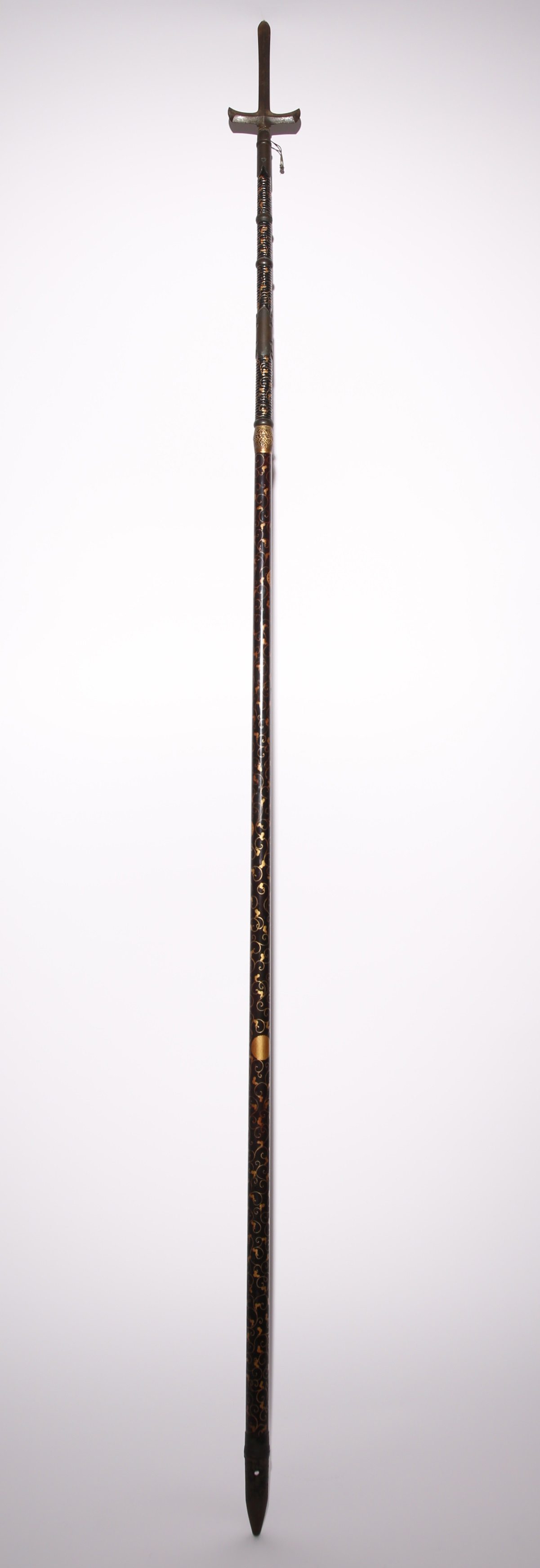 The long pole decorated with scrolling tendrils and sixteen-petalled chrysanthemum mon, in gold lacquer hiramaki-e on the black roiro ground, 208cm.