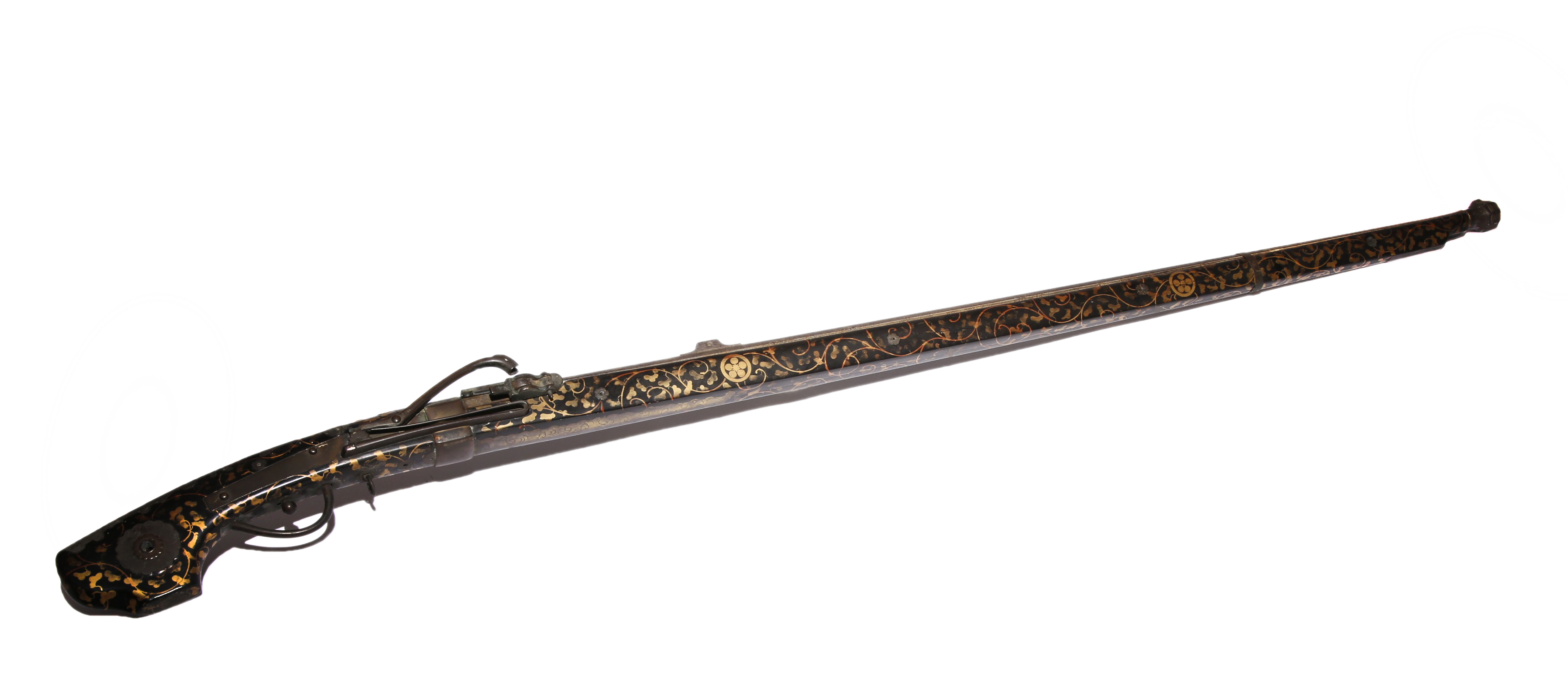 With an iron octagonal-section barrel inlaid with a writhing dragon in gilt, the wood stock decorated with scrolling tendrils and circular mon in gold hiramaki-e on the black roiro lacquer ground, with many metal elements shaped as prunus and chrysanthemum flowerheads, 130cm.