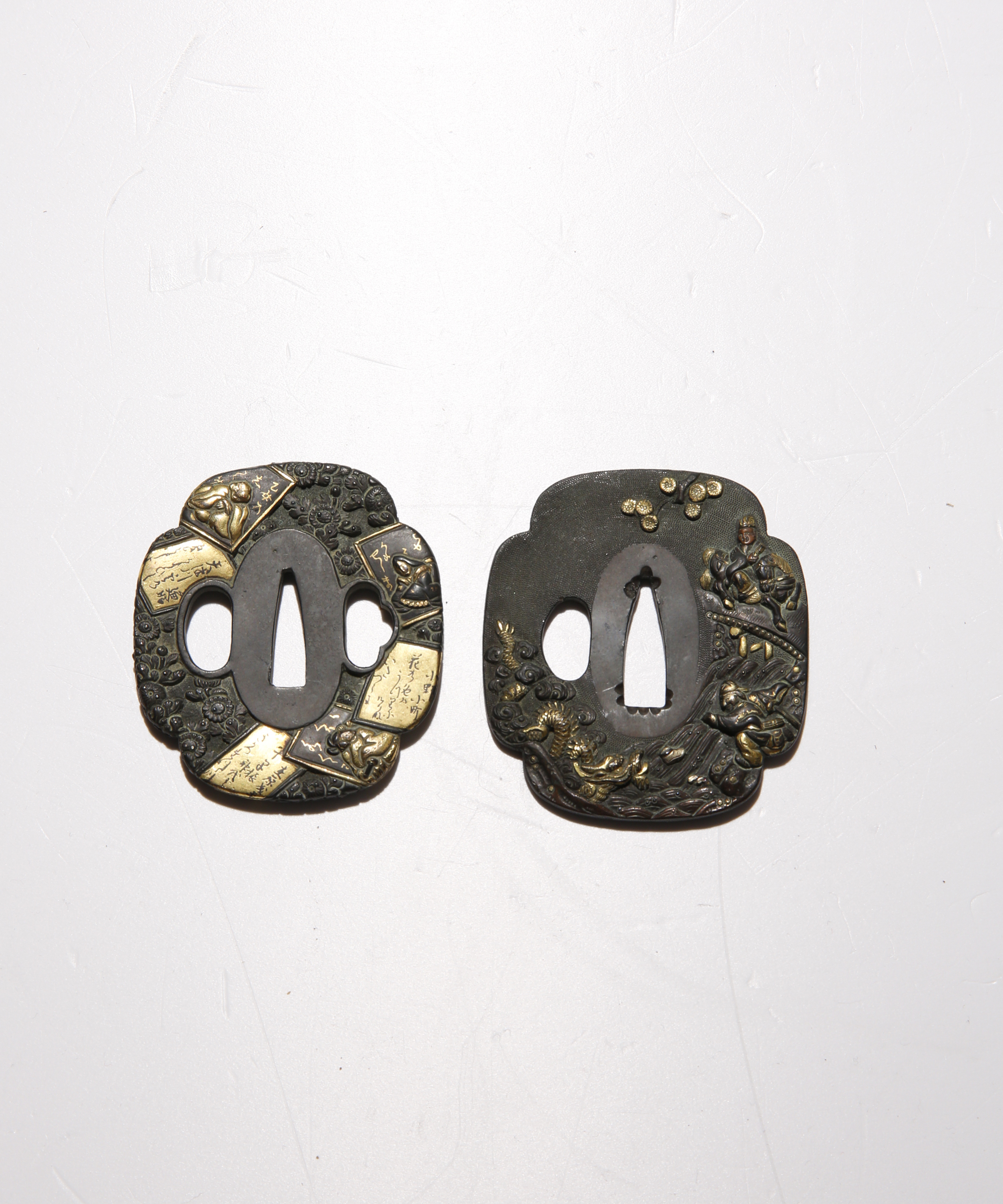 Half the cards from a hyakunin isshu uta karuta game set depict famous Japanese poets, and the other half is painted with calligraphy. The aim of the game is to associate the authors with their writings. The other tsuba depicts the story of Choryo and Kosekiko: Choryo was a hero who met an old man named Kosekiko on a bridge. The wise man began to teach him the art of war. One day, Kosekiko decided to test Choryo and threw his shoe into a river where a powerful water dragon lived. The dragon seized the shoe, but Choryo defeated it, and he gave the shoe back to Kosekiko.