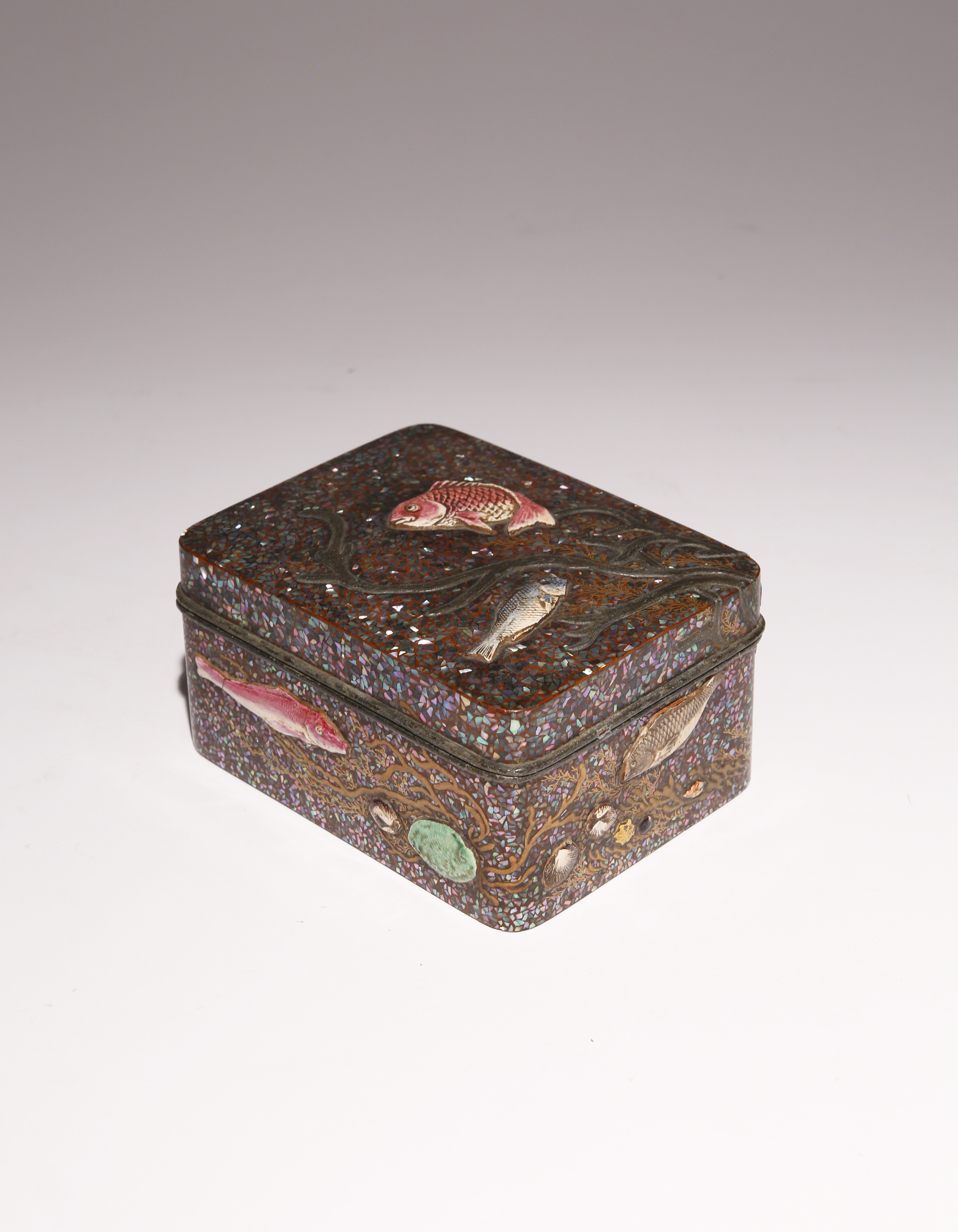 The rectangular body and lid decorated in relief with a variety of fish and seashells in polychrome ceramic, the animals swimming amongst seaweed rendered in gold lacquer, all on a dense ground of mother of pearl inlays, 7cm x 9.6cm x 12.2cm. (2)