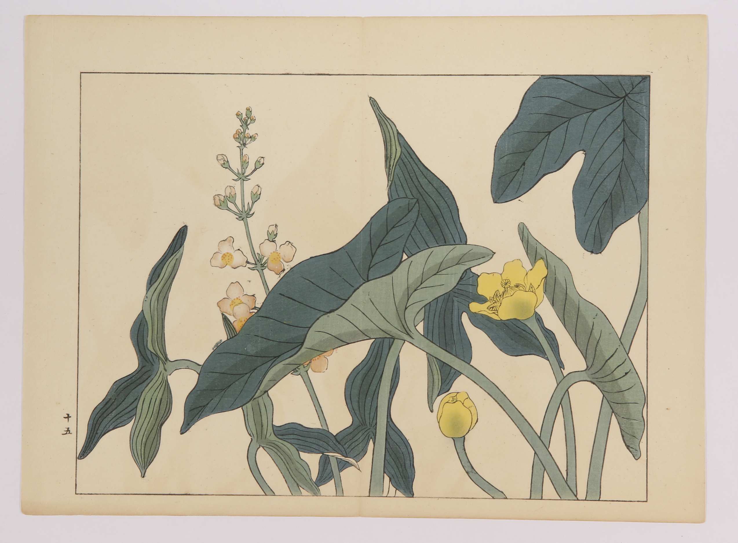 Twenty-one Japanese woodblock prints from a series entitled Shiki no Hana (Flowers of the Four Seasons), fourteen of the sheets depicting a variety of floral designs, the others with calligraphy listing the flowers depicted and giving individual descriptions, some in English and others in Japanese, all approx. 27.5cm x 35cm. (21)