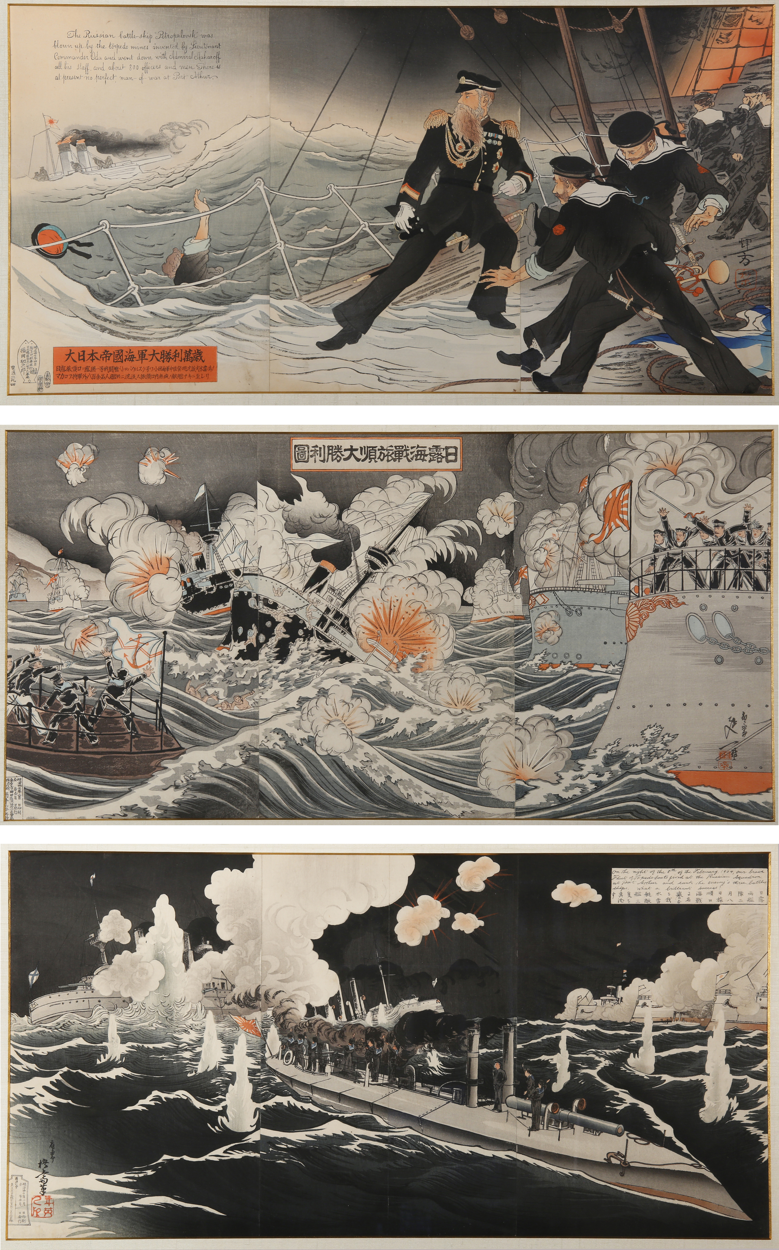 ); the second by Migita Toshihide (1863-1925) entitled Nichiro ryokantai nigatsu yoka no yo Ryojun-ko taikaisen ni meiyo naru waga no suiraitei tekkan niseki o gekichin-su (In the Great Sea Battle between the Japanese and Russian Navies on the Night of 8 February at the Straits of Lushun, Our Illustrious Torpedo Boat Sinks Three Enemy Ships), together with a third triptych depicting another naval battle, all framed and glazed, all approx. 35cm x 70.5cm. (3)