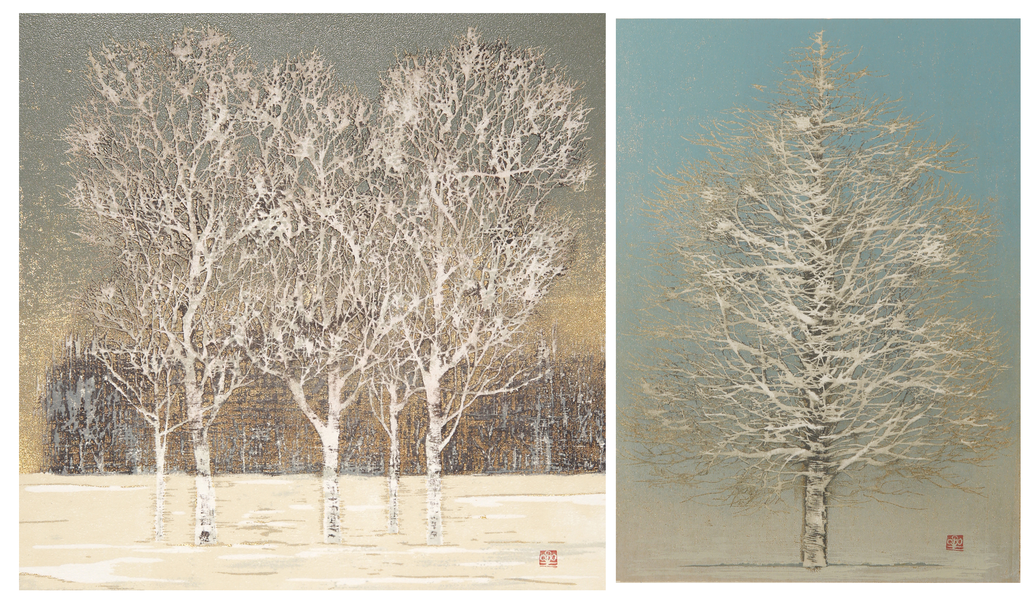 Two Japanese woodblock prints with metallic pigments depicting trees, the first rectangular picture entitled Soshun (Early Spring) with a single birch, framed and glazed; the second loose square print entitled Fuyu kodachi (Trees in Winter) depicting a small grove, both signed in pencil and dated by the artist, 24.5cm x 24.5cm max. (2)