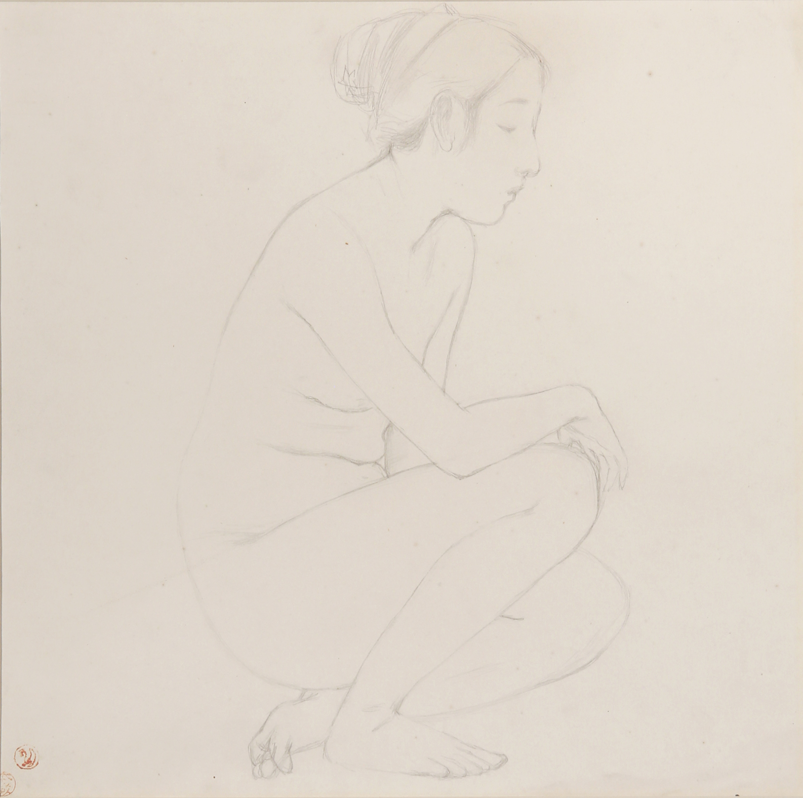 A Japanese pencil study of a nude, possibly by the artist Hashiguchi Goyo (1881-1921), the beauty depicted comfortably seated, her eyes lowered, with two red seal marks to the bottom left corner, one reading Honjo, the reverse with another incomplete nude, framed, 33.5cm x 33.5cm.