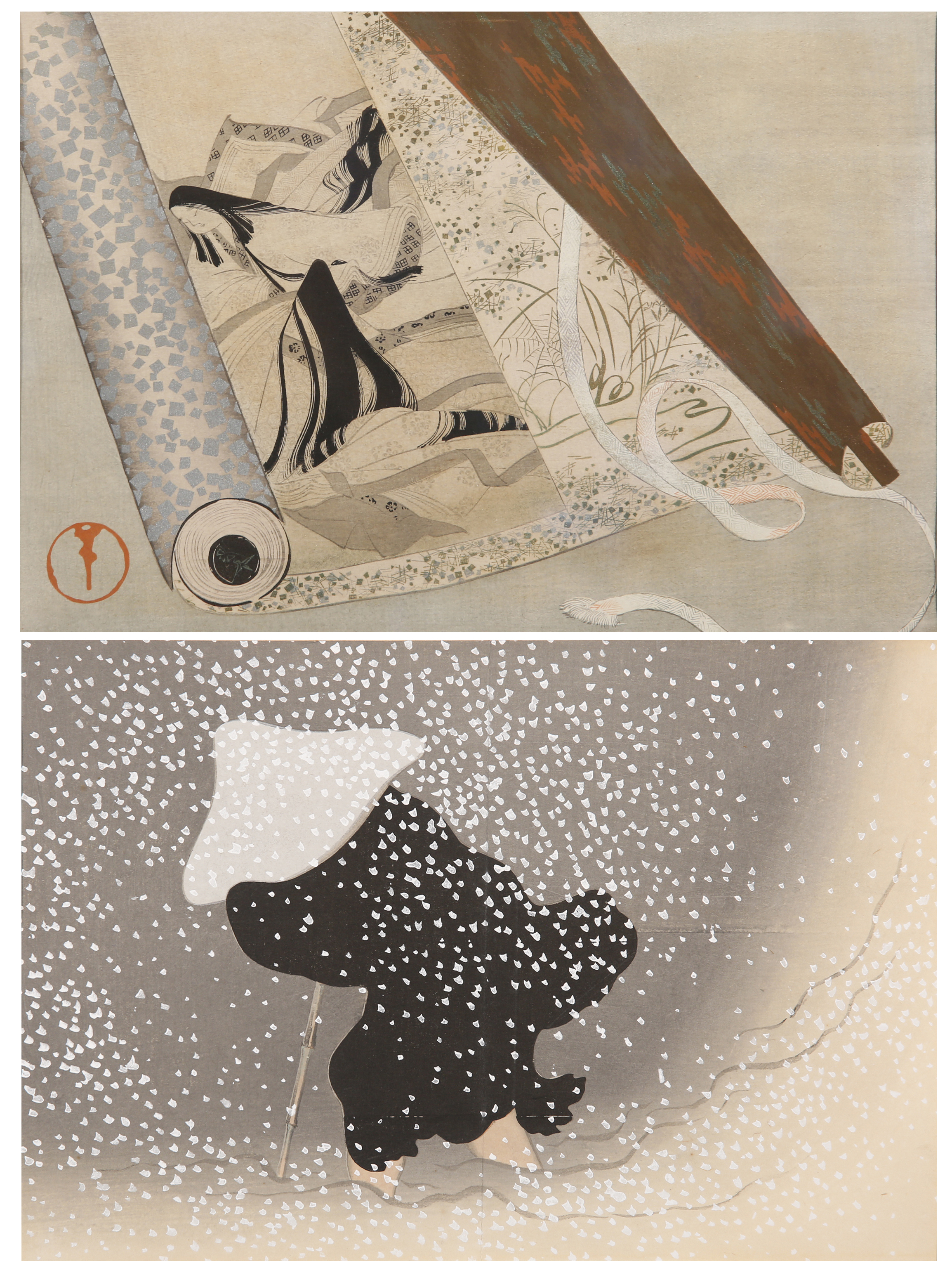 Two Japanese woodblock prints, one entitled Tomoe no Yuki (Whirling Snow) from the album Momoyogusa (A World of Things) depicting a traveller caught in a snow storm; the other depicting a makimono, the handscroll partly open to reveal two beauties wearing Heian-style garments, with a red seal mark, both prints framed and glazed, 28cm x 43cm max. (2)
