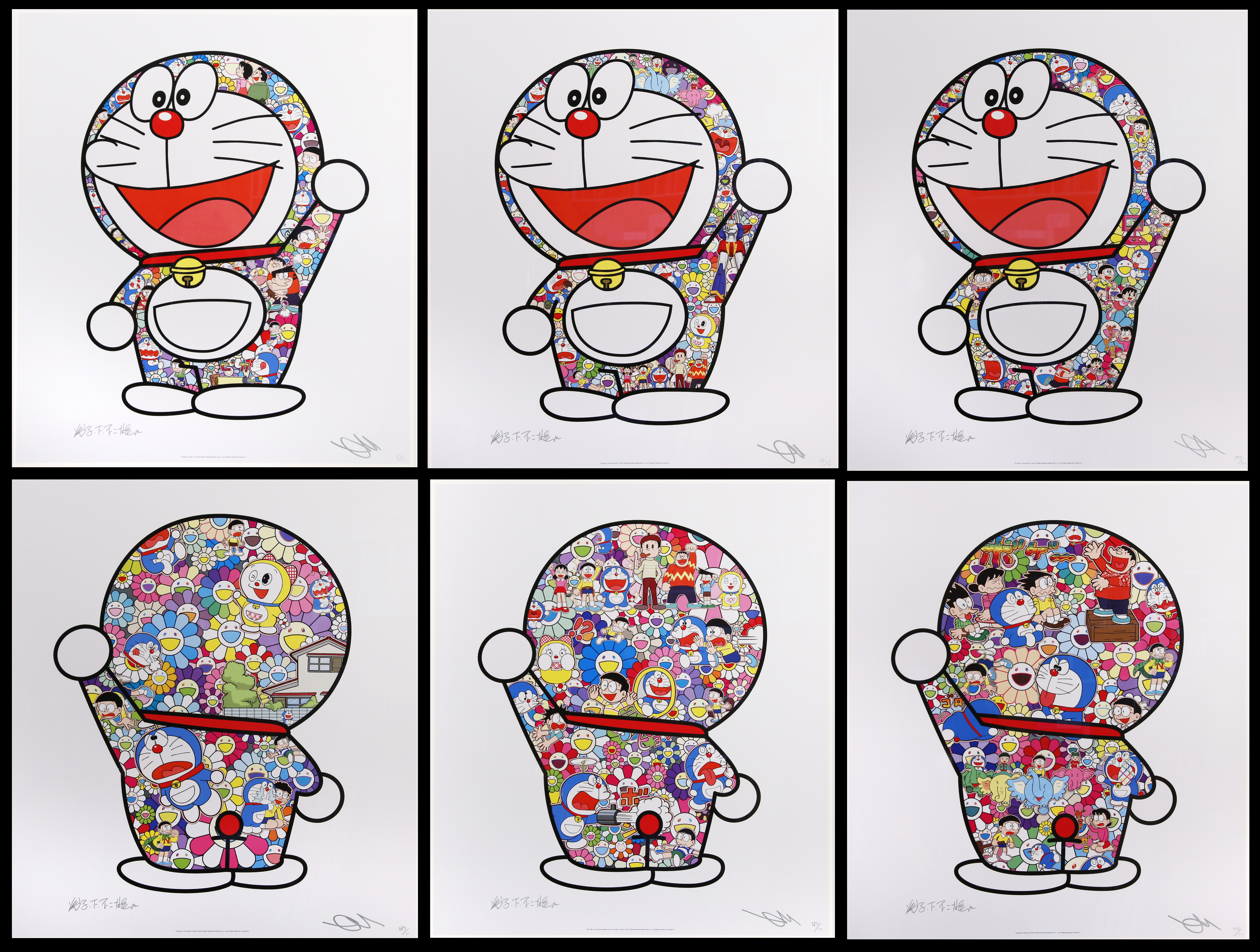 ', 'Doraemon's Daily Life', 'Doraemon and Author Fujiko F. Fujio are in the Field of Flowers', and 'Doraemon in the Field of Flowers', three depicting Doraemon from the front and three from the back, all published by Kaikai Kiki Co., Ltd., Tokyo, all signed Murakami in silver ink, framed and glazed, all approx. 57cm x 65cm. (6)
