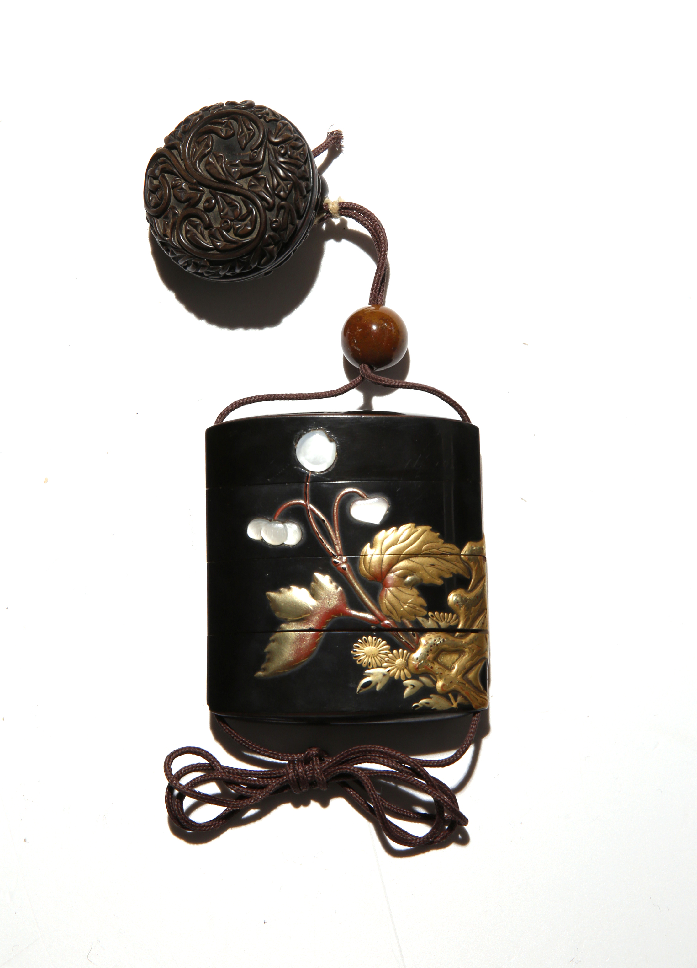 Decorated with a continuous design of flowers issuing from a rocky outcrop, with small chrysanthemums to one side and large white blossoms made of mother of pearl inlays, the rest of the decoration rendered in gold takamaki-e and hiramaki-e, with a glass ojime, a wood bead and a manju netsuke carved with a dense design of leafy tendrils, the inro 7.4cm.