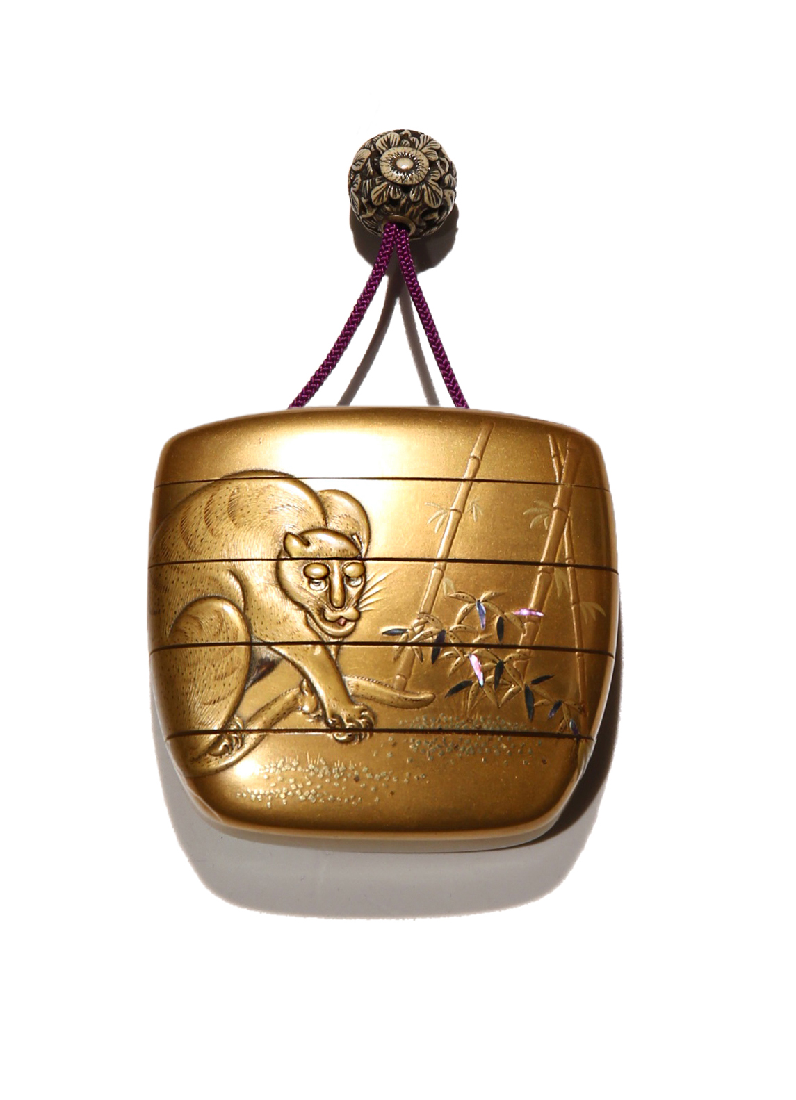 Decorated in the style of Kano School paintings with a large tiger seated on its haunches in a bamboo grove, the eyes of the big cat inlaid in light horn, the design in gold takamaki-e and hiramaki-e, the reverse with branches of bamboo rendered in raden mother of pearl inlays, attached to a reticulated ivory ojime carved with many flowerheads, the inro 6.9cm.