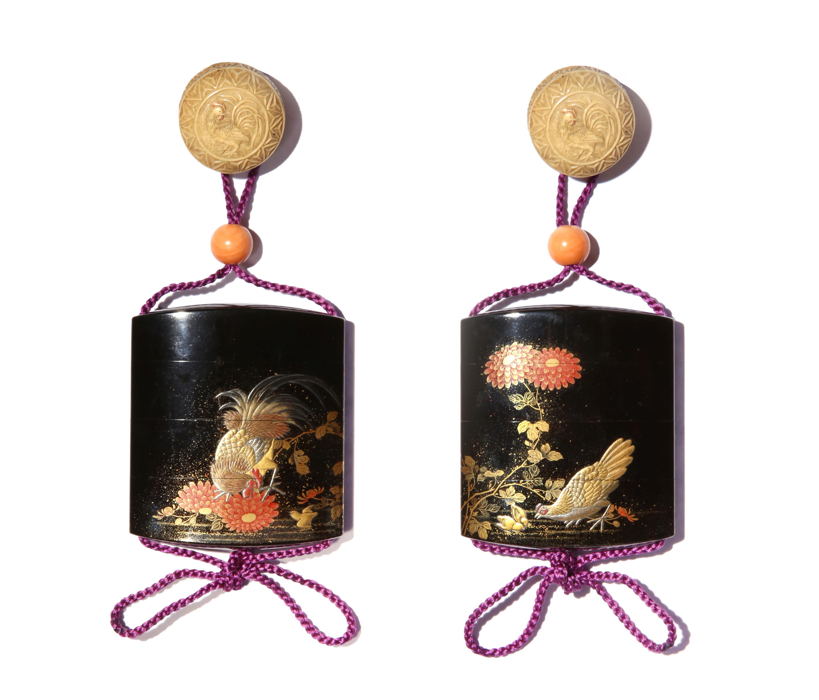 Decorated with a continuous design of a cockerel, a hen and their chicks pecking seeds, the birds amongst large chrysanthemum flowers, the design rendered in gold, silver and red takamaki-e and nashiji lacquer on the black roiro ground, a two-character signature with kao to the base; attached to a coral ojime and with an en-suite ivory manju netsuke with a large cockerel to the top, the inro 7.4cm.