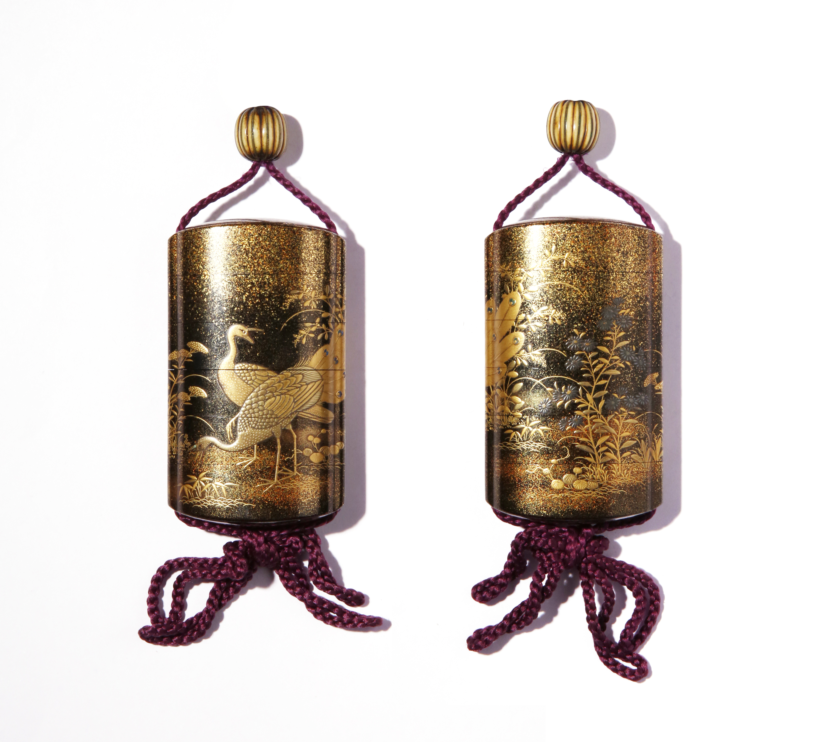 Decorated with a continuous design of two peacocks in a luxuriant garden, the male bird pecking at the ground whilst his companion looks to the side, with many flowering branches around them, the eyespots inlaid in mother of pearl and the rest of the design rendered in gold and silver takamaki-e, nashiji and hiramaki-e lacquer on the black roiro ground, signed underneath with a three-character mark in gilt reading Inagawa saku and with a red pot seal mark, together with a melon-shaped stag antler and metal ojime, the inro 8.2cm.