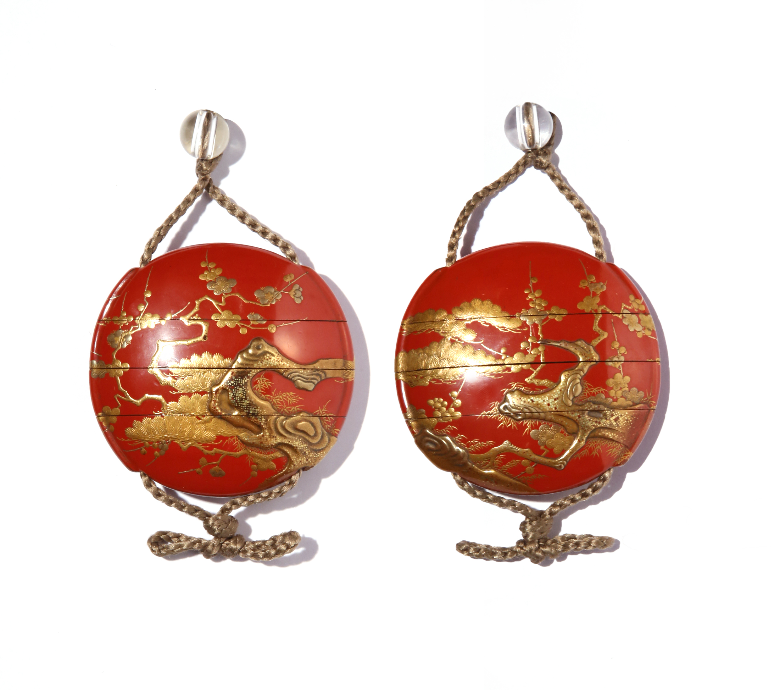 The flattened circular body richly decorated to each side with the Shochikubai (the Three Friends of Winter), with branches of pine, flowering prunus, and bamboo sprays rendered in gold and silver takamaki-e, hiramaki-e and kirikane on the deep red ground, together with a rock crystal ojime and a kiri box, 7.2cm. (2)
