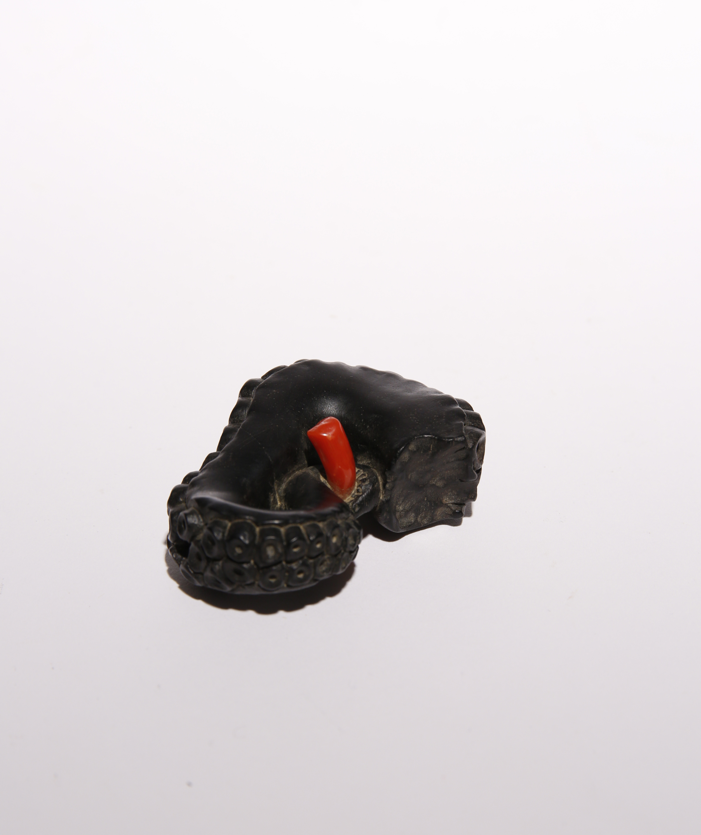 Naturalistically modelled as the severed tentacle of an octopus, the carving in dark wood, possibly ebony, the tentacle with realistic suckers to the side and the end entwined around a small branch of coral, 5.5cm.