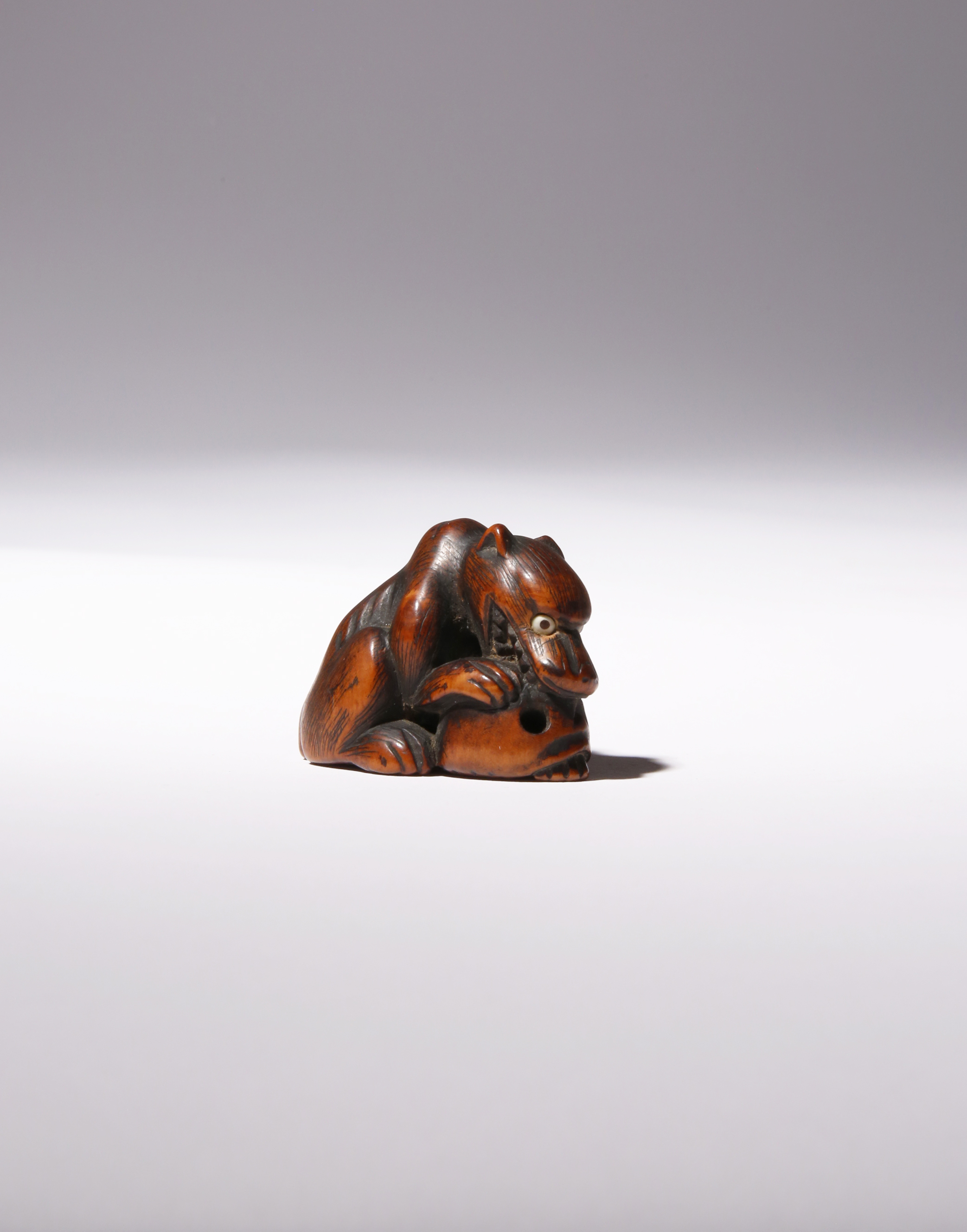 A JAPANESE WOOD NETSUKE OF A WOLF OR YAMA-INU (WILD DOG)