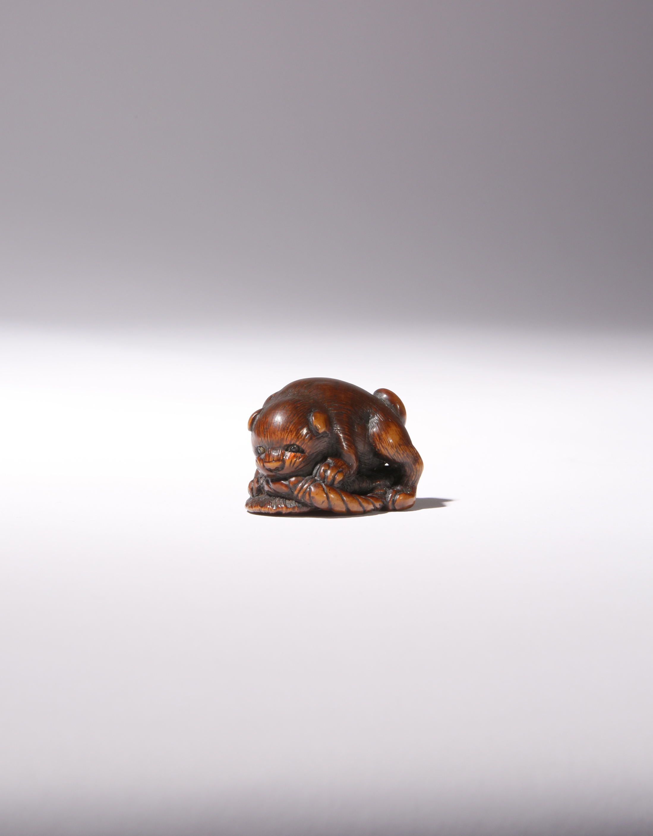 A JAPANESE WOOD NETSUKE OF A PUPPY