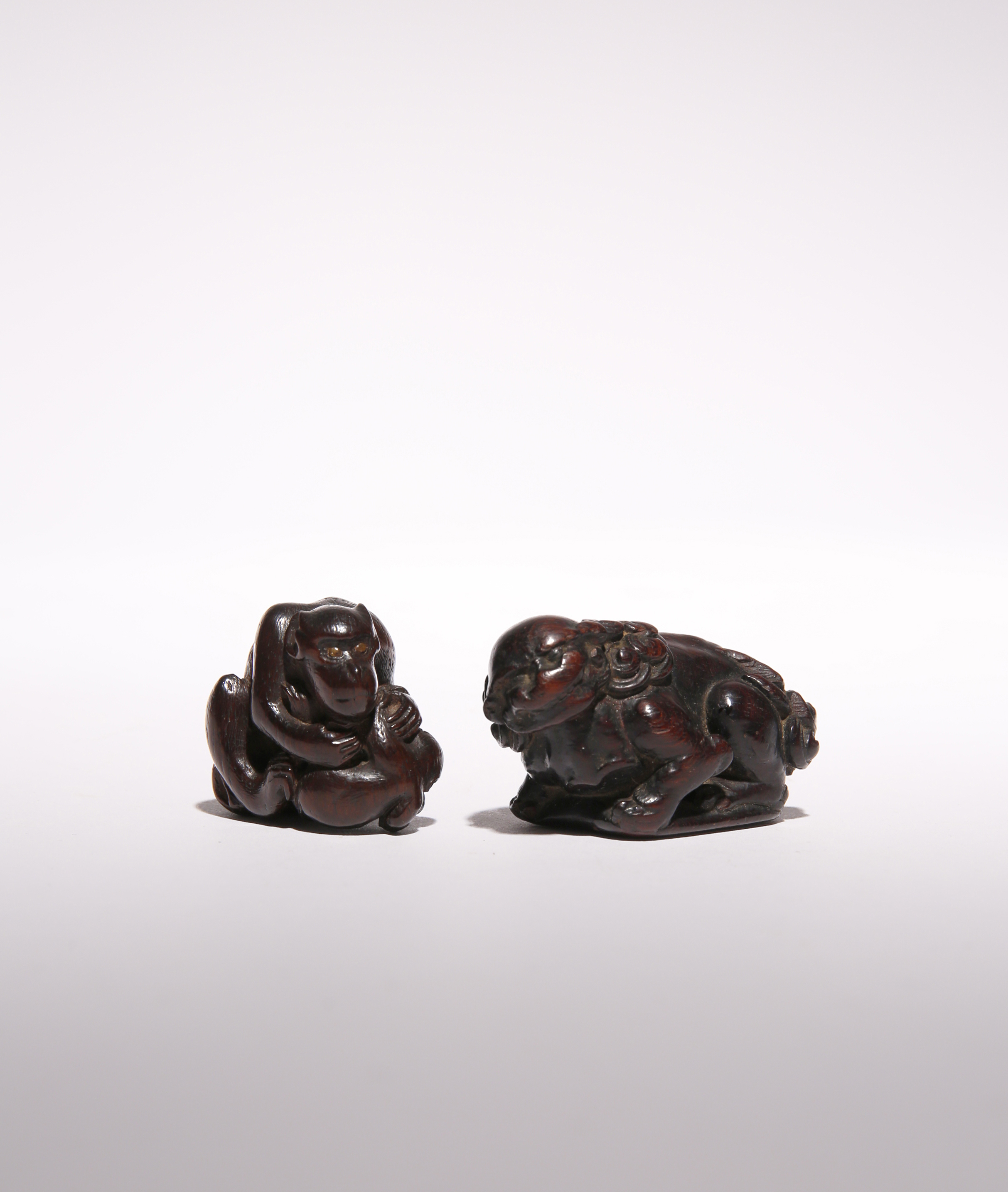 The first carved as a monkey delousing its young whilst the infant eats a fruit, the larger primate with its eyes inlaid in light horn, a two-character signature underneath; the other carved as a lion dog, the shishi crouching on a shaped base, the carved features worn with age, unsigned, 4cm and 5.3cm. (2)