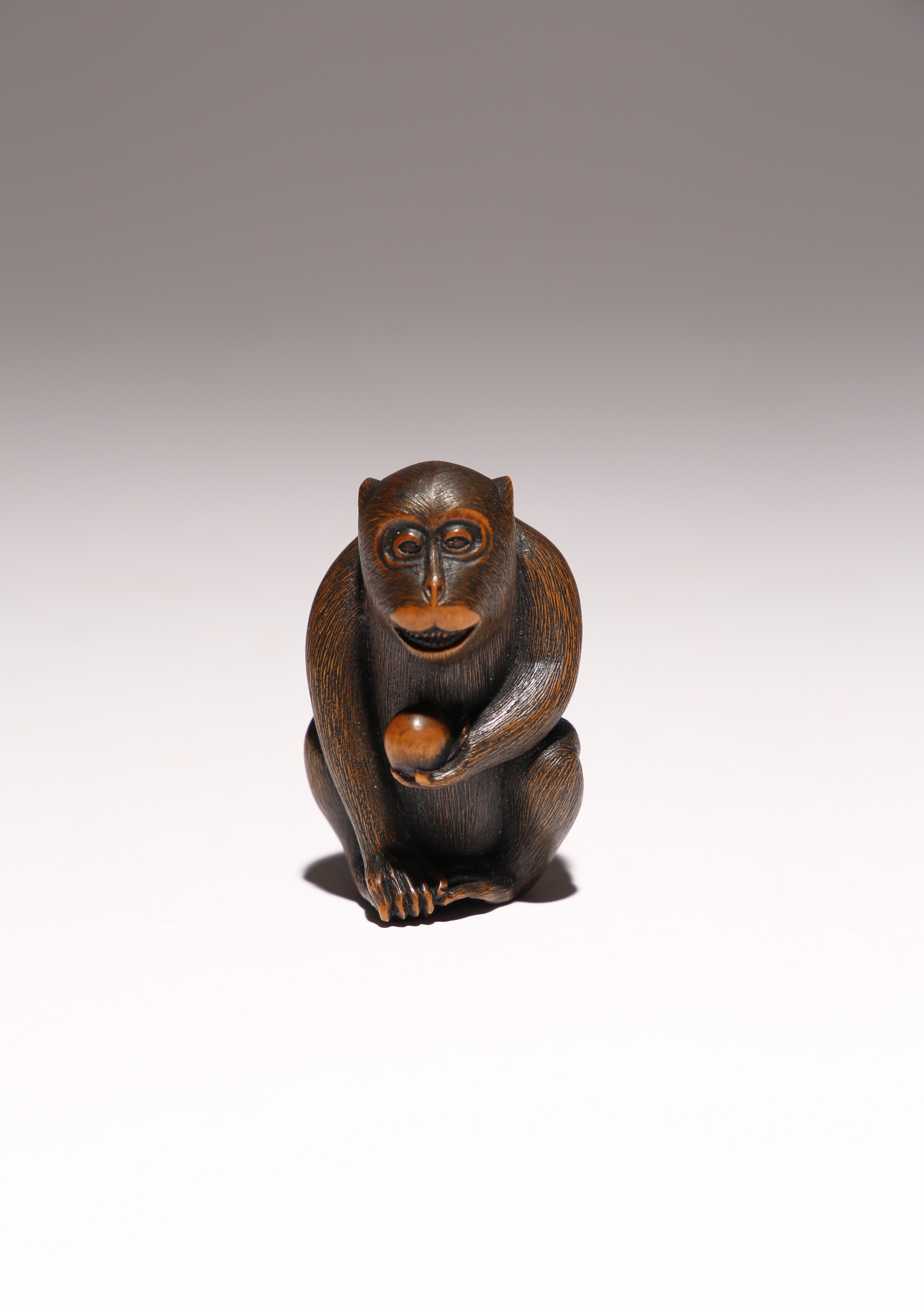 The large primate seated on its haunches, a contented expression on its face as it holds a peach before its chest, its other hand comfortably resting on its feet, signed Masanao underneath, possibly for Masanao of Yamada (Ise Province), 5.2cm.
