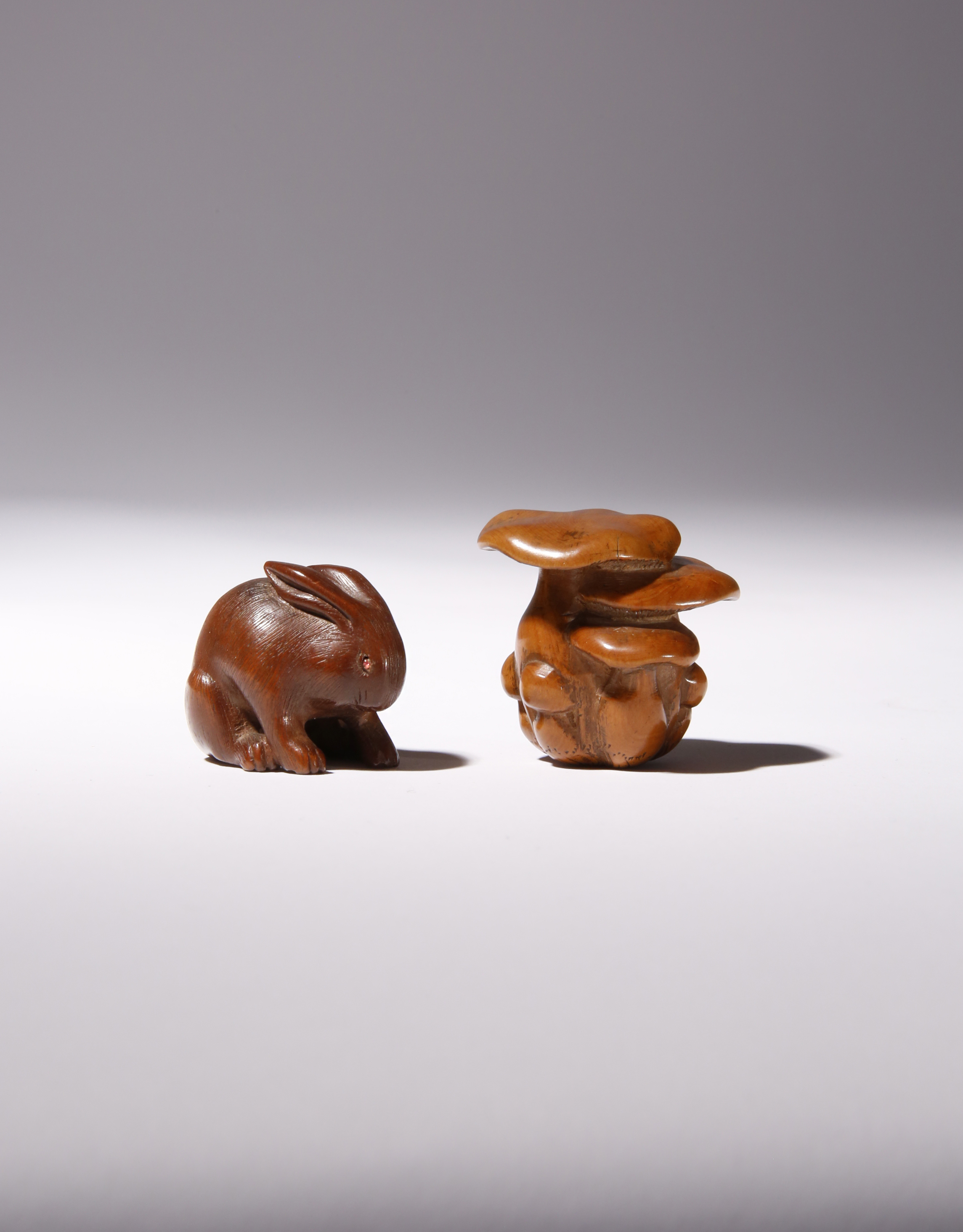 The first boxwood and carved as a cluster of mushrooms, the fungi of different sizes and the stalk of one forming the himotoshi, signed Masanao underneath; the other in darker wood and depicting a small plump rabbit, its eyes inlaid with minute pink beads, 3.6cm and 3.7cm. (2)