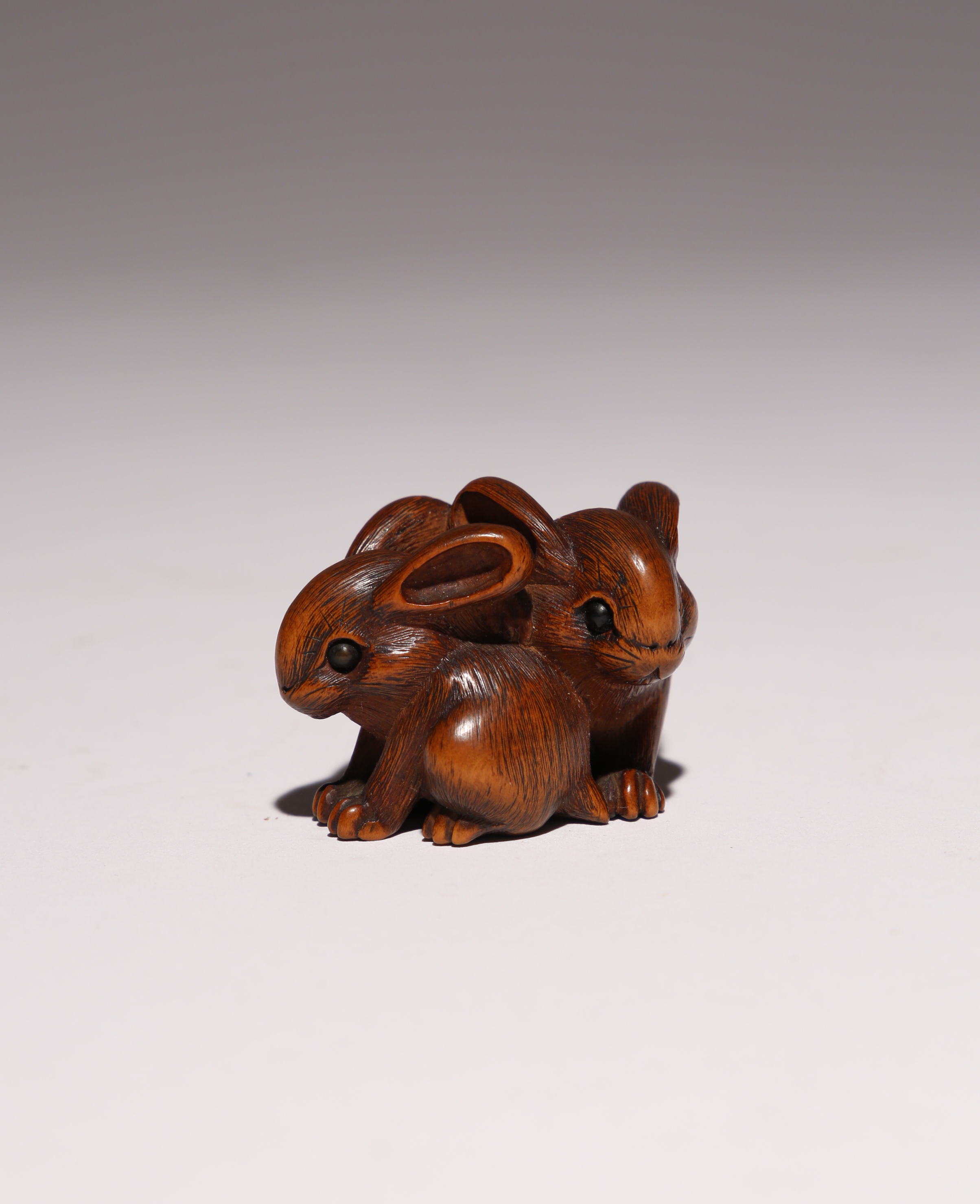 The charming animals huddled against each other, both carved with long ears and large eyes inlaid with black beads, 4cm.