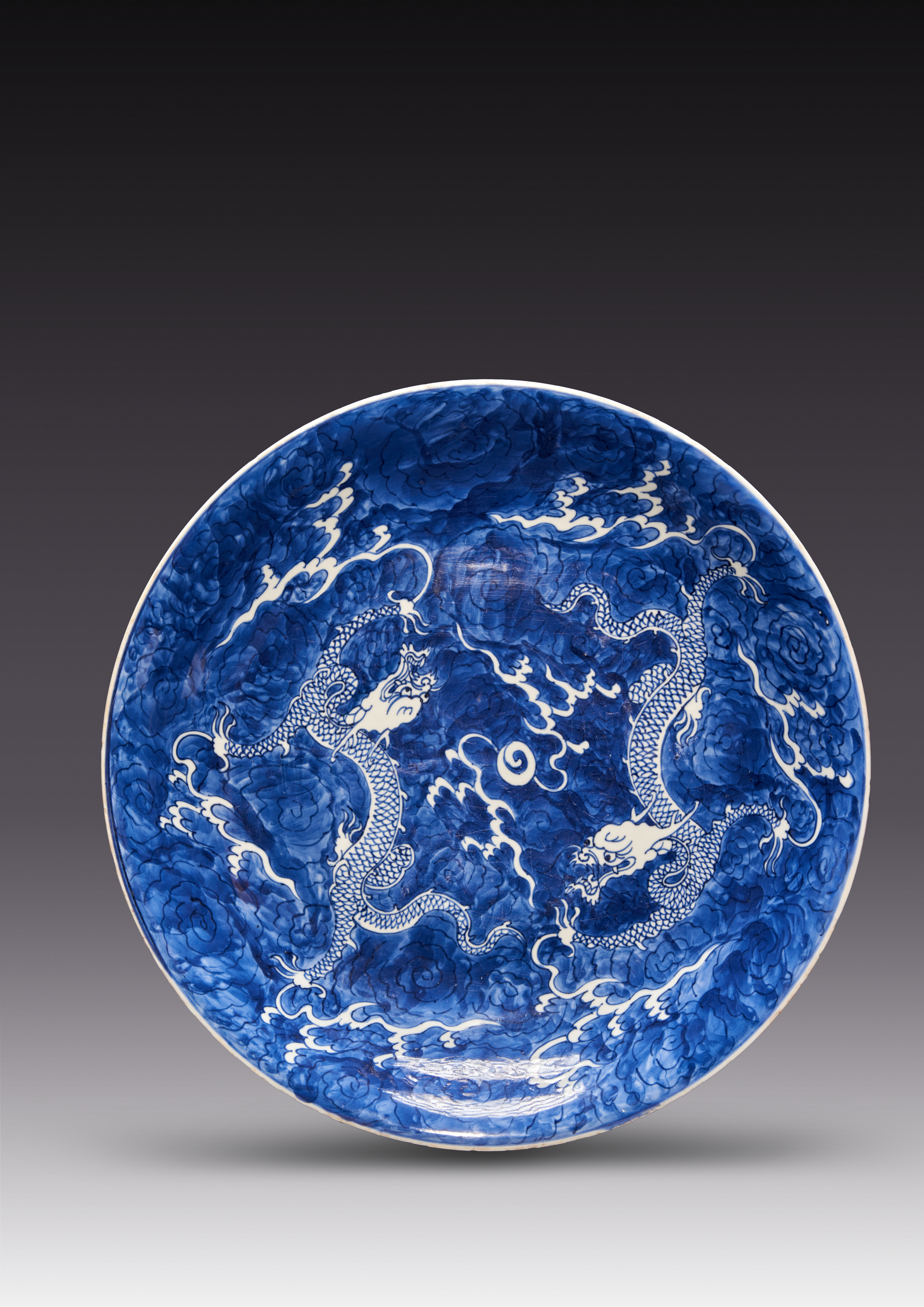 With a gently flared rim, painted with two white fierce scaly dragons contesting a flaming pearl of wisdom upon a blue-ground, with scrolling clouds finely outlined in darker blue, the reverse with four ribbon-tied Buddhist emblems, the base with a square seal mark within a channel foot ring, 35.2cm.