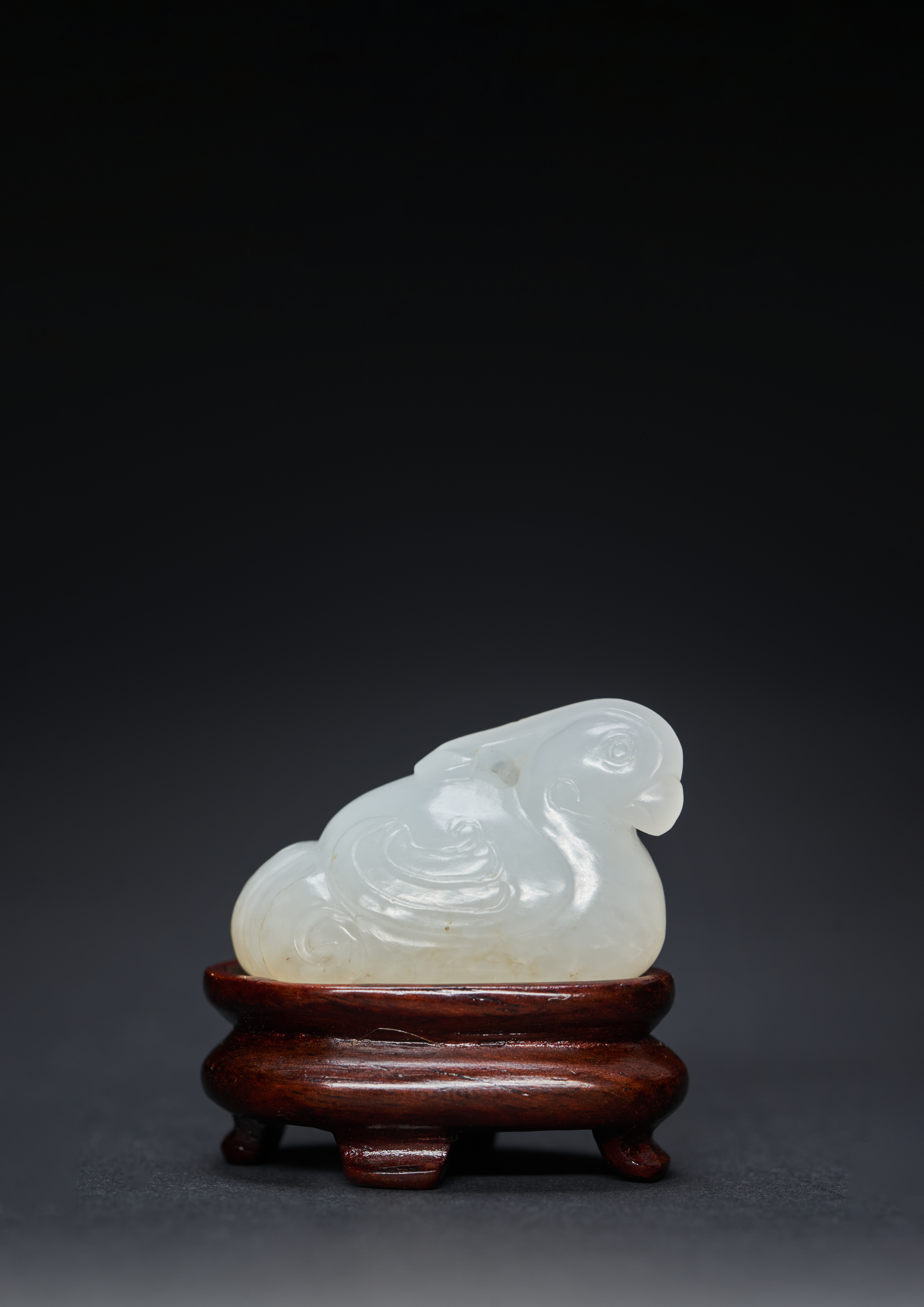 The white stone with delicate amber coloured inclusions to the base, the bird with its head turned slightly to dexter, with a long crest curling around its back, the wings and tail finely defined, the feet picked out in low relief, together with a wood stand, 3.5cm. (2)