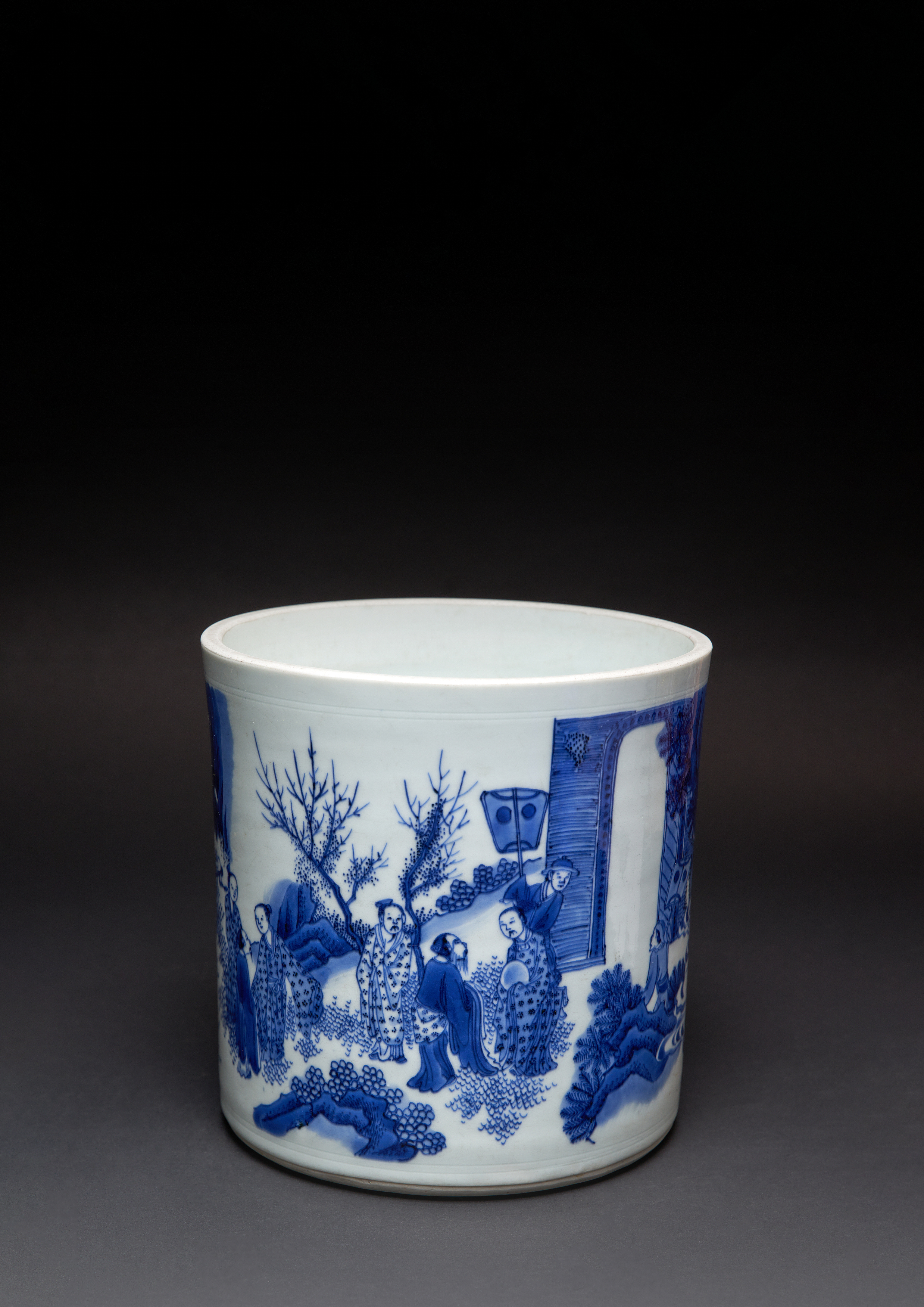 A GOOD AND LARGE CHINESE BLUE AND WHITE CYLINDRICAL BRUSH POT, BITONG