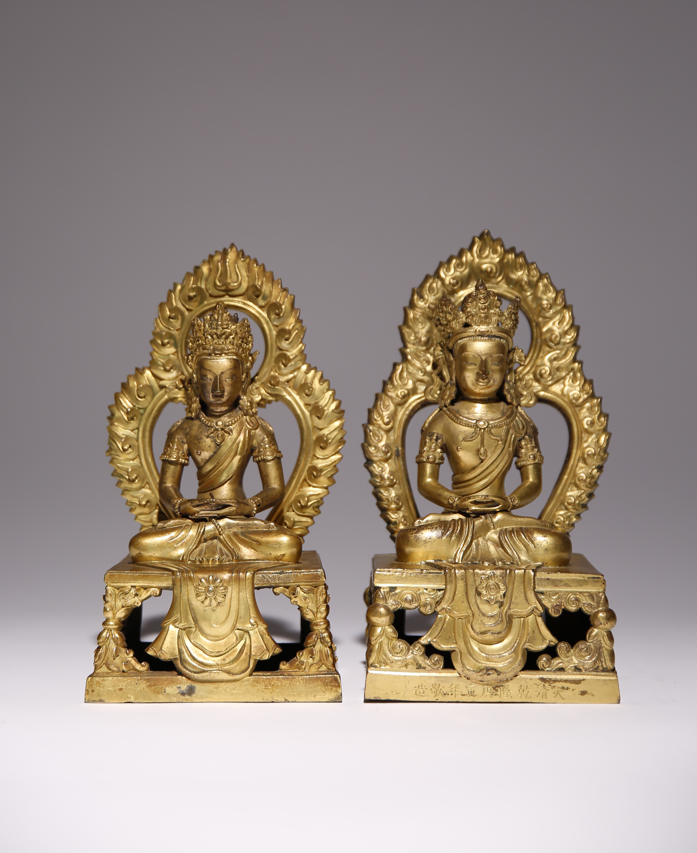 Each seated in dhyanasana on a rectangular flaring throne with waisted foliate corners draped with a long cloth, fitted with a separate flame-bordered mandorla, their hands are in dhyana mudra and both with a jewelled necklace and robes draped over the left shoulder, the taller figure with a nine character Qianlong mark on the front edge, dated 1770, 1.07kg and 1.85kg, 21.6cm and 20.5cm. (2)