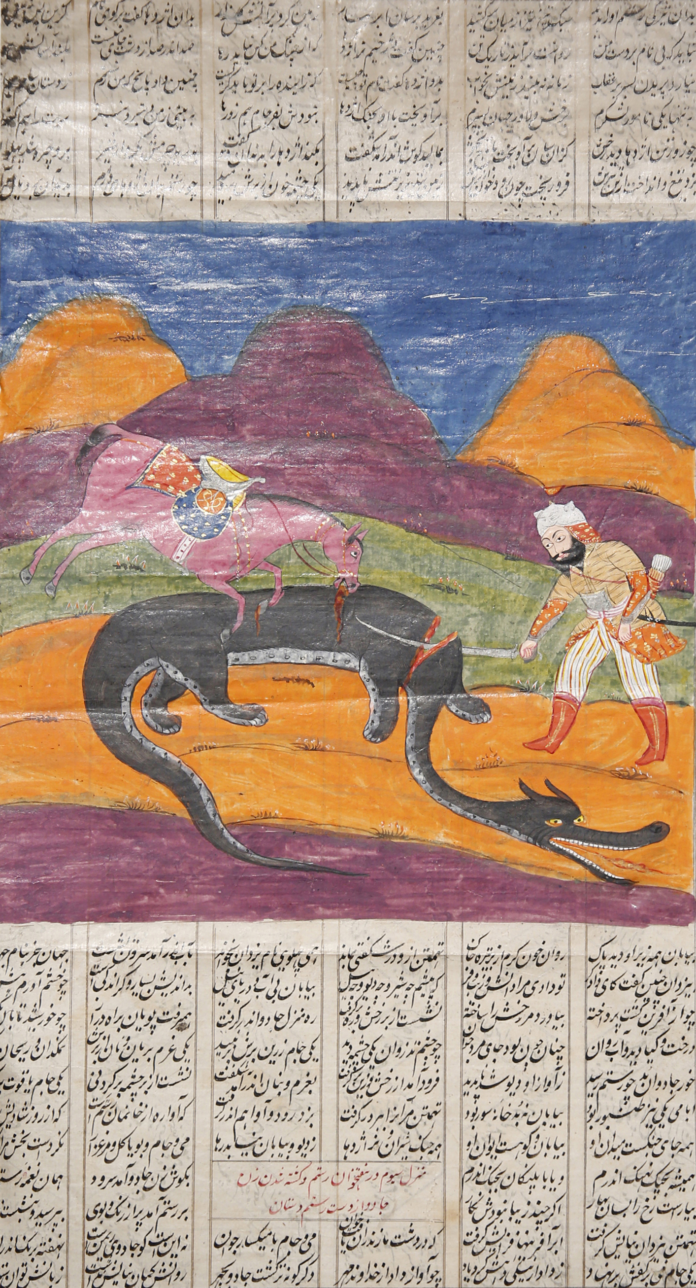 One depicting Rostam slaying the dragon, the other with Rostam in pursuit of a rider, 47cm x 24cm max. (2)