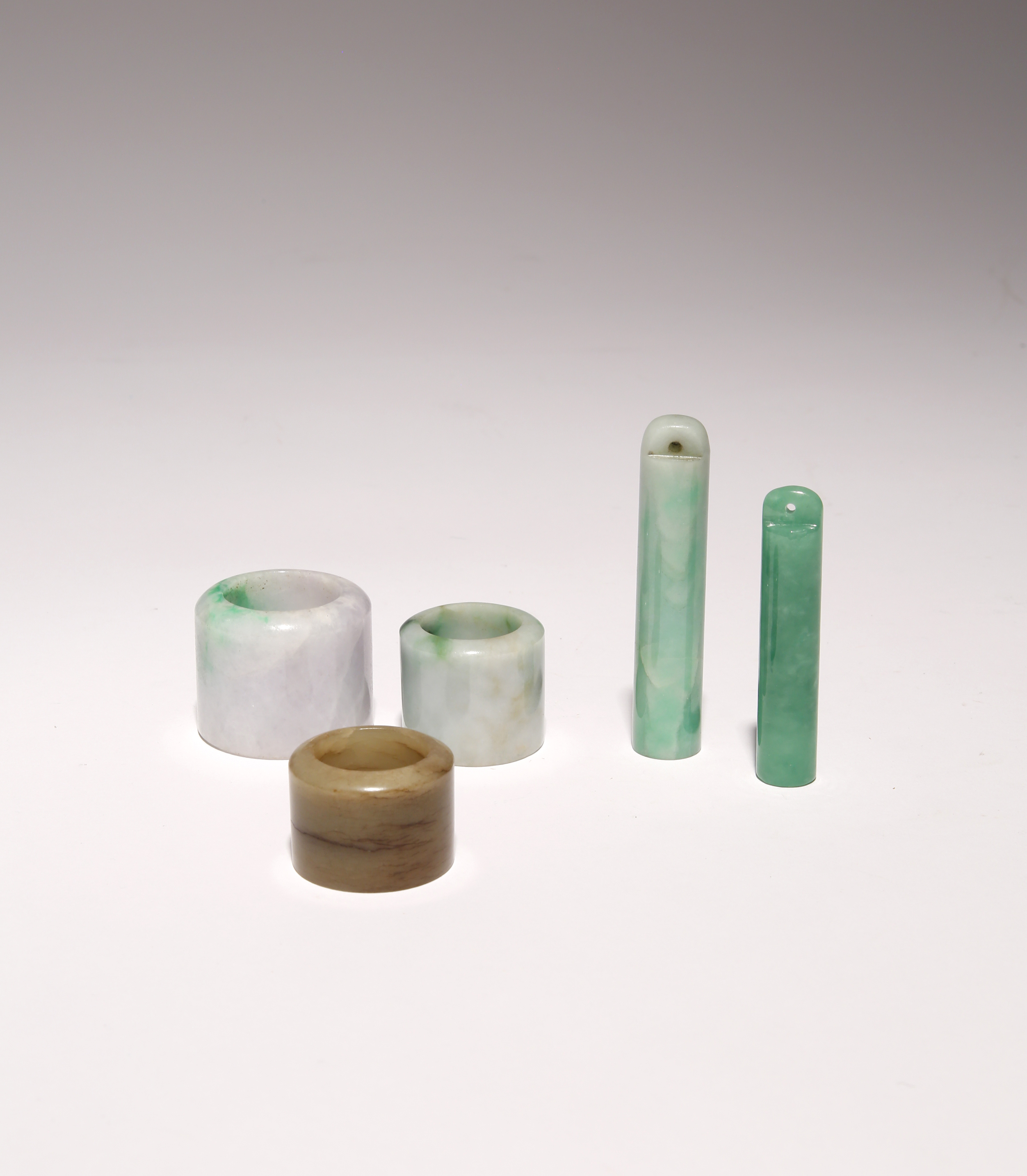 The rings and hat ornaments with apple green and cloudy inclusions, together with a nephrite jade archer's ring, 7cm. (5)