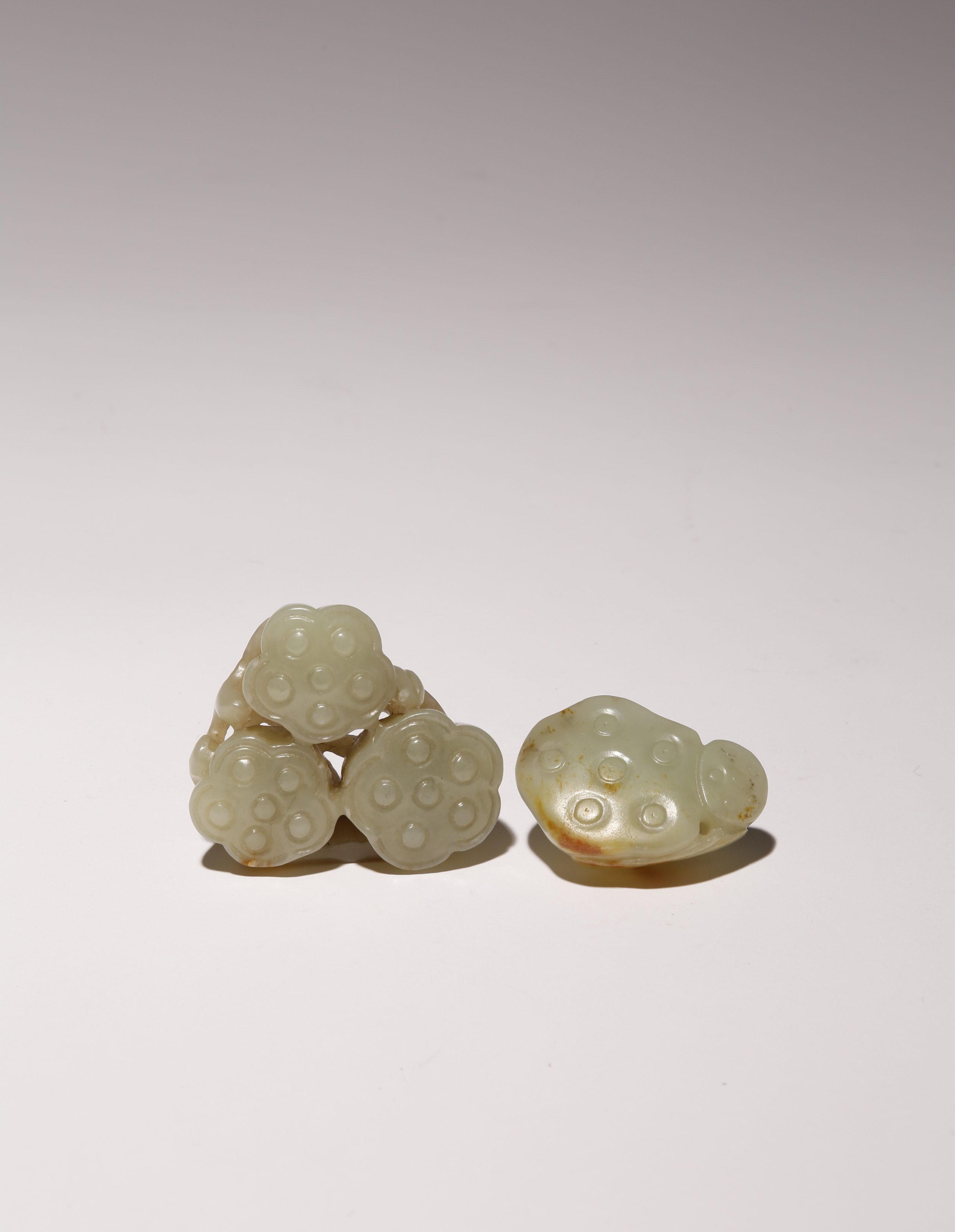 TWO CHINESE CELADON JADE LOTUS SEED PODS