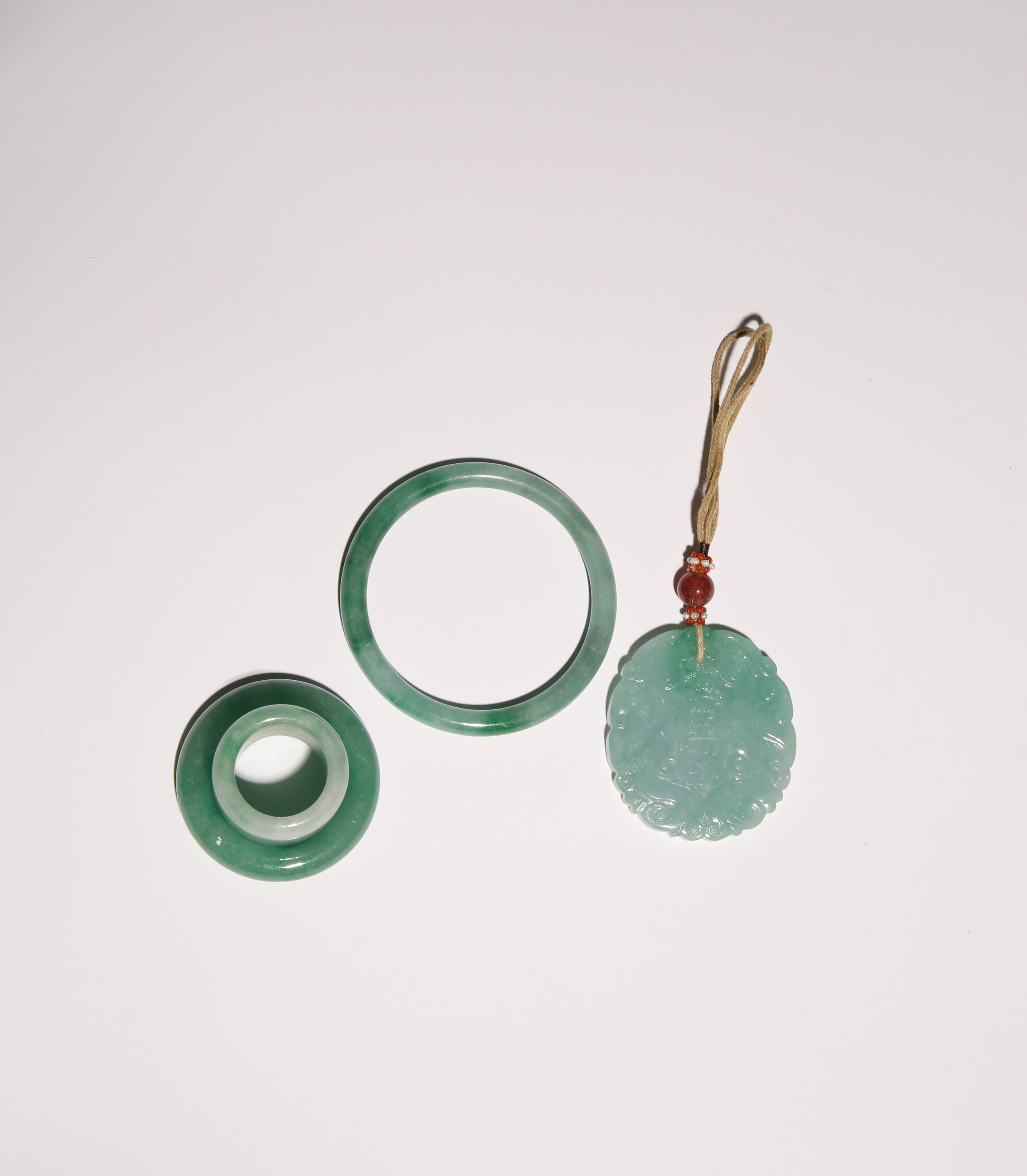 Comprising: an oval dragon pendant, carved with two characters to each side, an archer's ring, a bangle and a smaller ring. (4)