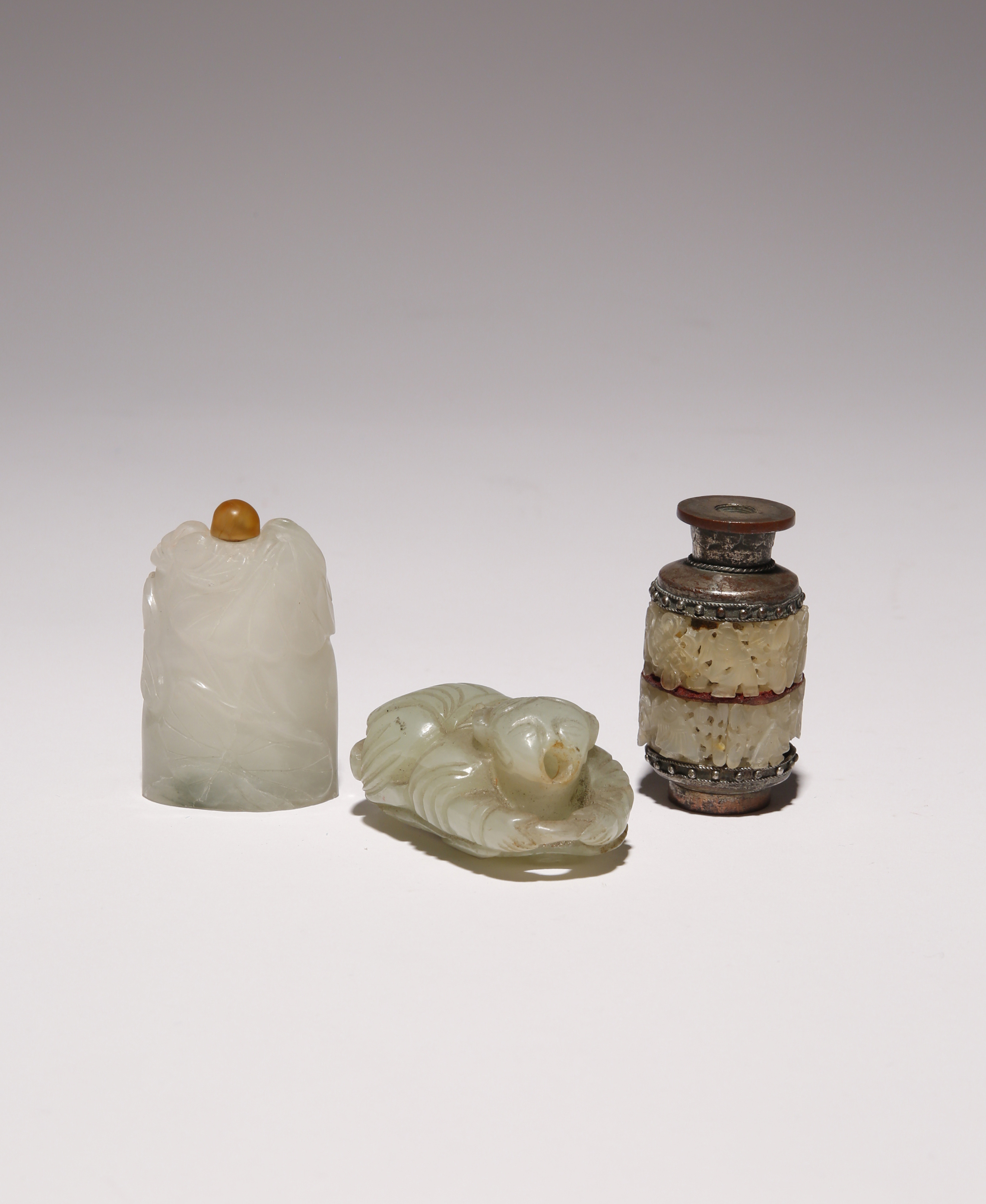 One in white jade, carved as a seal with lotus leaves in relief, another as a crouching boy, the third carved with figures and endless knots, 5.5cm. (3)