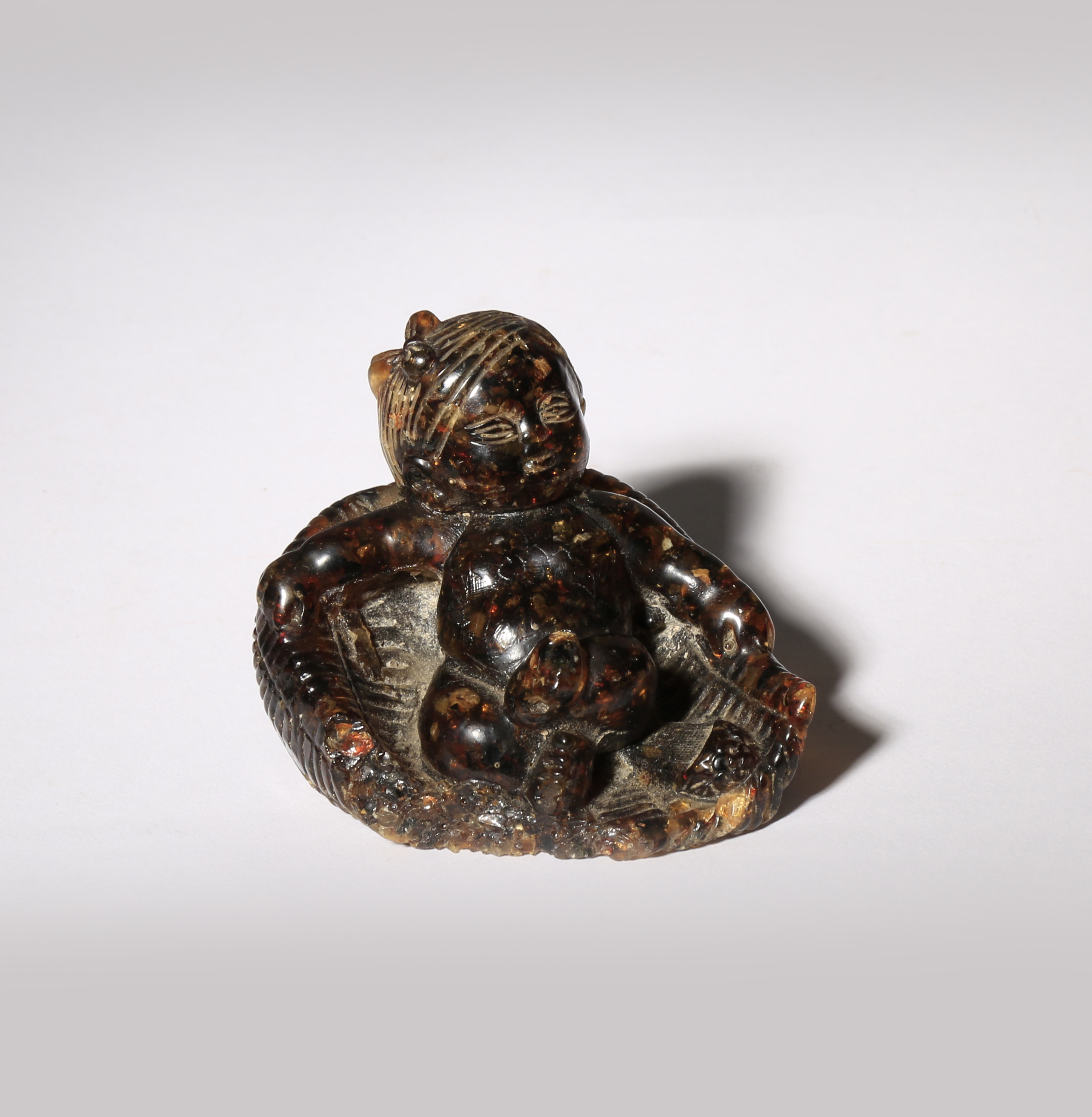 A RARE CHINESE AMBER CARVING OF AN INFANT IN A BASKET